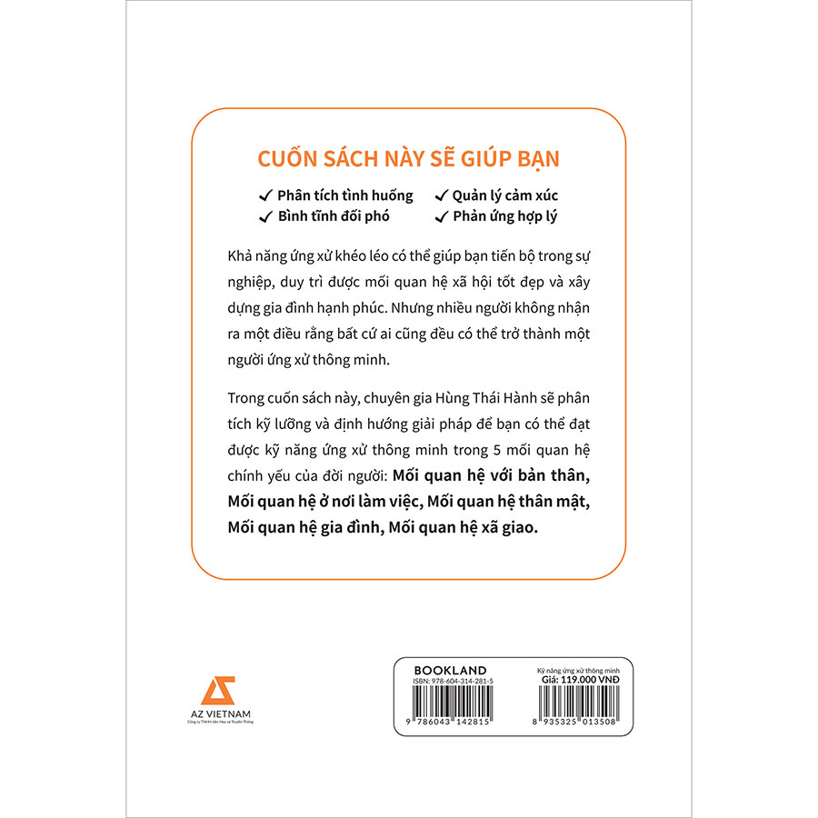 Để giúp bạn đạt được điều này, chuyên gia phân tích các mối quan hệ Hùng Thái Hành đã tập hợp những bài học giao tiếp thiết thực nhất trong cuốn sách “Kỹ năng ứng xử thông minh”. Ở đây, bạn sẽ học được cách tạo dựng và bồi dưỡng 5 mối quan hệ chính yếu của đời người: Mối quan hệ với bản thân - Mối quan hệ ở nơi làm việc - Mối quan hệ thân mật - Mối quan hệ gia đình - Mối quan hệ xã giao.