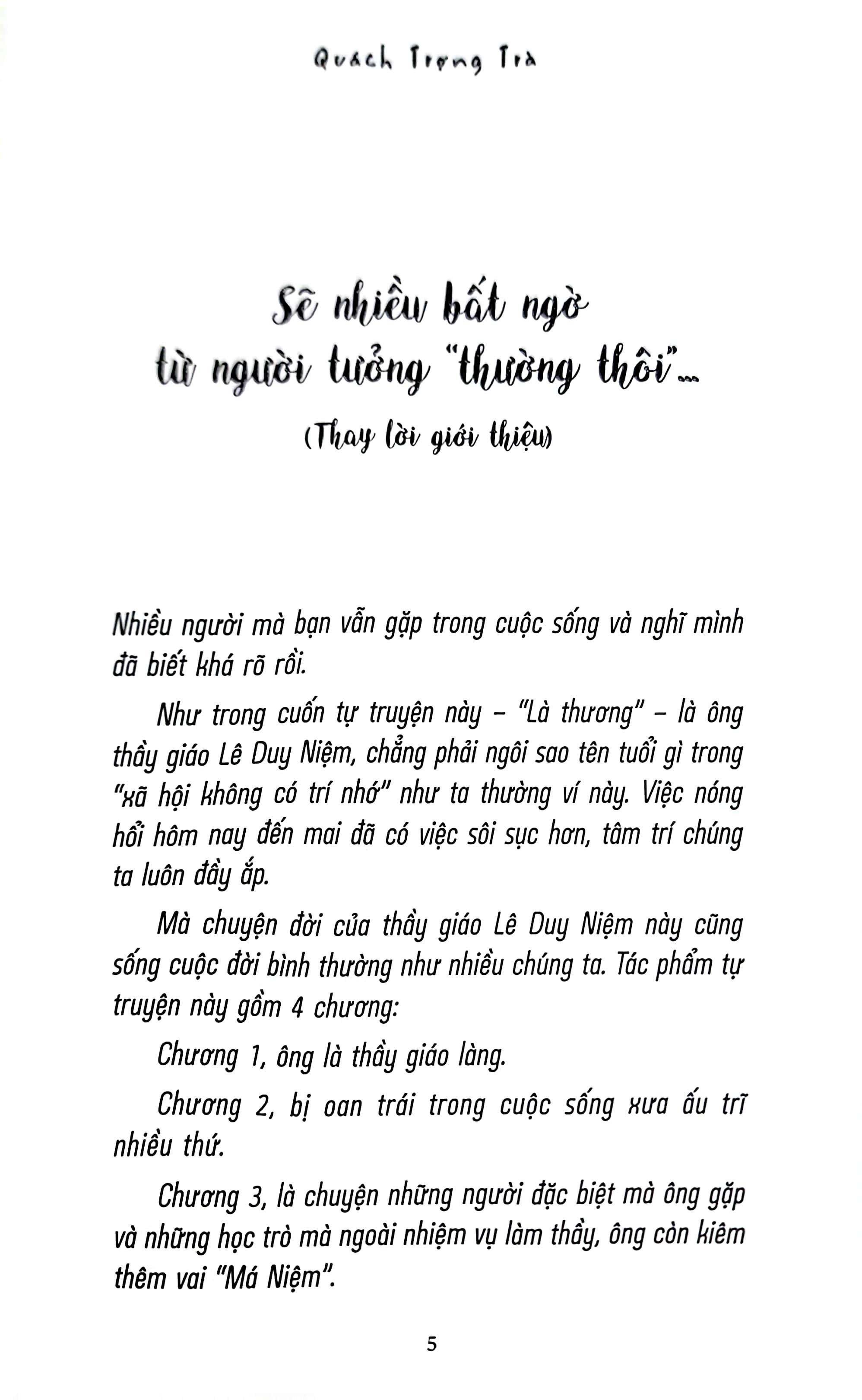 Là thương - Tự truyện ông thầy không bục giảng Lê Duy Niệm là cuốn tự truyện của một ông giáo khởi đầu nghiệp gõ đầu trẻ từ một làng quê hẻo lánh ở Bạc Liêu. Bất ngờ gặp ""sự cố"" nghề nghiệp, ông buộc phải rời bục giảng rồi lênh đênh nổi trôi lên Sài Gòn. 13 năm sau, ông giáo đã trở về với đàn em thân yêu trong vai trò giáo viên quản nhiệm. Ông chăm sóc đời sống nội trú cho học sinh ở một trường tư thục tại thành phố Hồ Chí Minh thật trọn vẹn, lòng vẫn nhớ thương về Bạc Liêu xứ cũ…