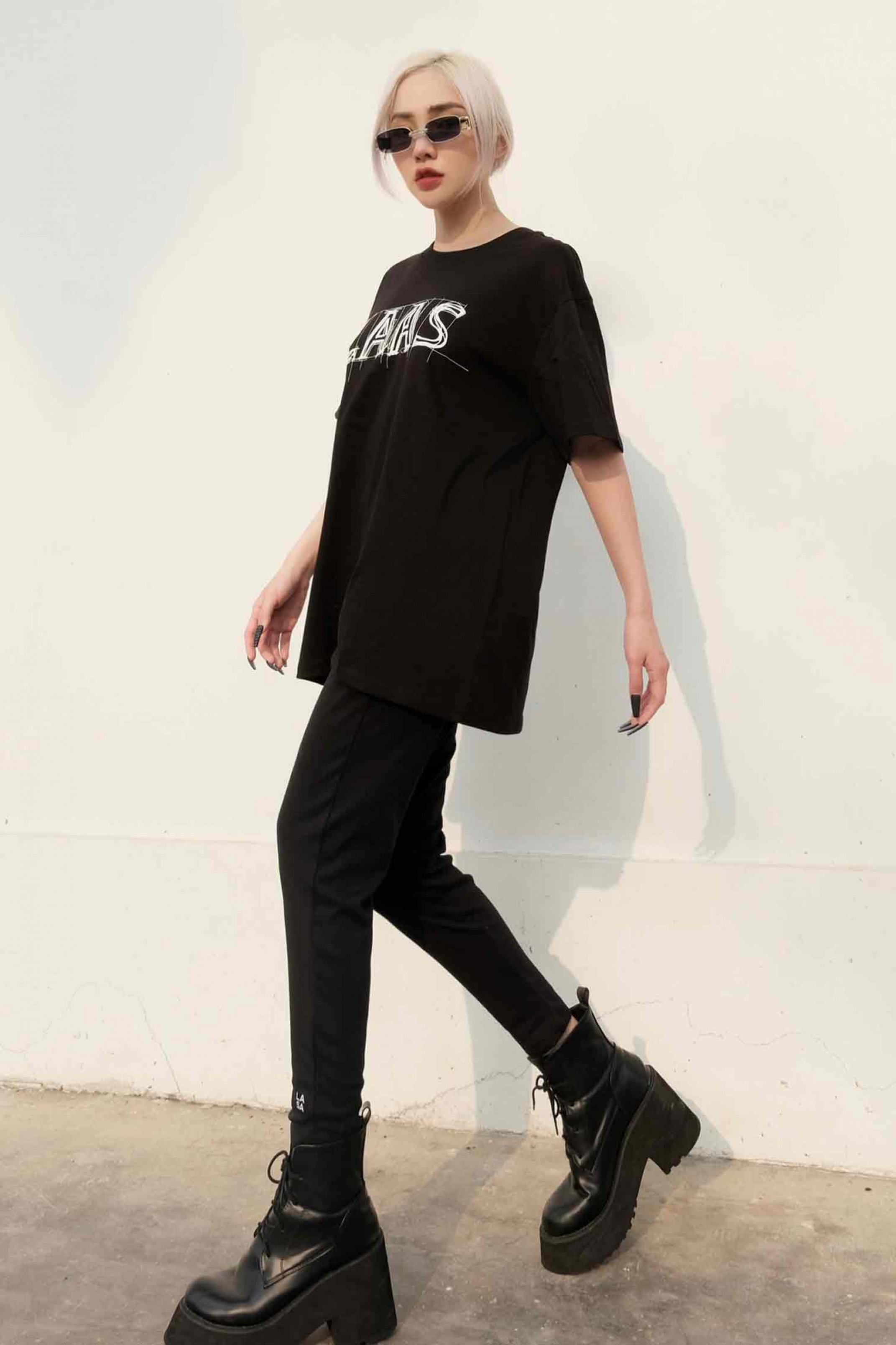 100% COTTON 2 CHIỀU, DÀY DẶN THOÁNG MÁT ÁO MÀU ĐEN FORM RỘNG ĐIỂM NHẤN HÌNH IN CHỮ LAAS MÀU TRẮNG