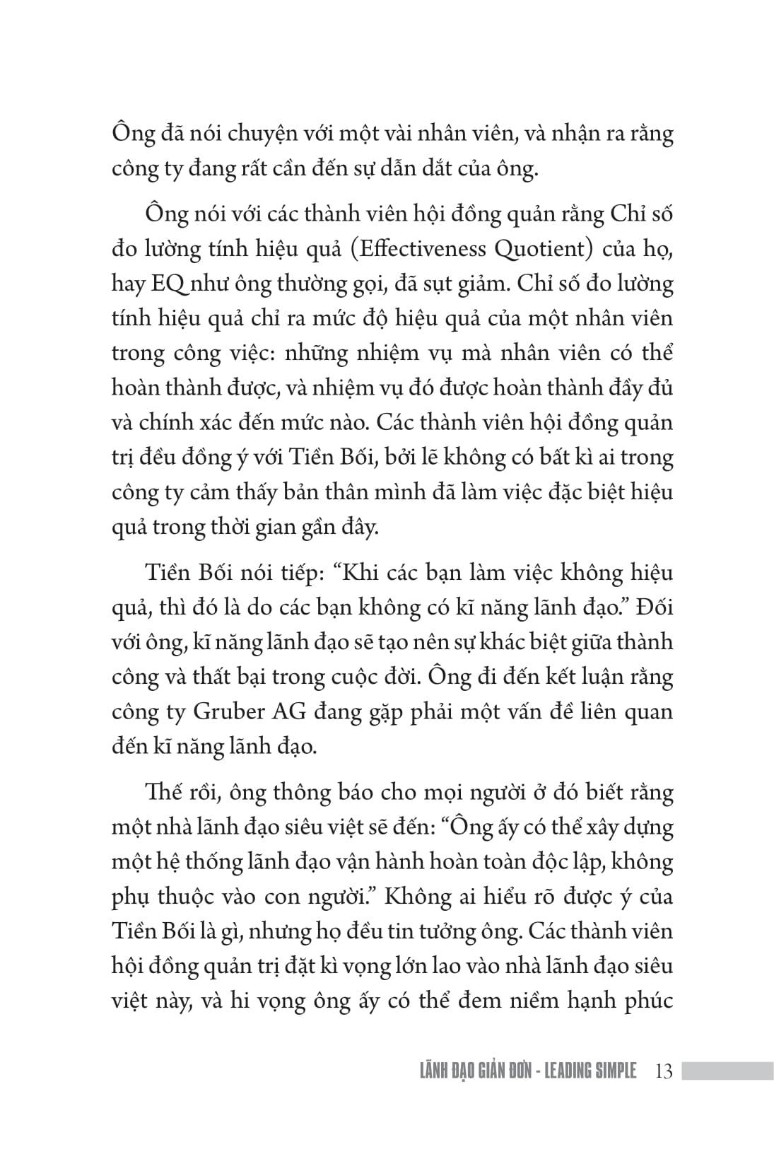 Trong câu chuyện sau đây, phần lớn tên của các nhân vật và địa điểm đã được thay đổi. Việc này nhằm thể hiện sự tôn trọng dành cho những người mong muốn được giữ kín danh tính của mình. Hệ thống Leading Simple (Lãnh đạo Giản đơn) được thể hiện bởi việc lãnh đạo bằng cái đầu, đôi tay và con tim. Những biểu tượng này nhắc nhở chúng ta phải luôn suy xét đến cả 3 yếu tố tạo ra hiệu quả trong việc lãnh đạo. Những nhiệm vụ đại diện cho cái đầu (làm gì?) Những công cụ đại diện cho đôi tay (bằng công cụ gì?) và Những nguyên tắc đại diện cho trái tim (làm như thế nào và tại sao?) "Khả năng lãnh đạo làm nên sự khác biệt giữa thành công và thất bại: sự khác biệt giữa một cuộc sống viên mãn và những điều tầm thường đầy chán nản."