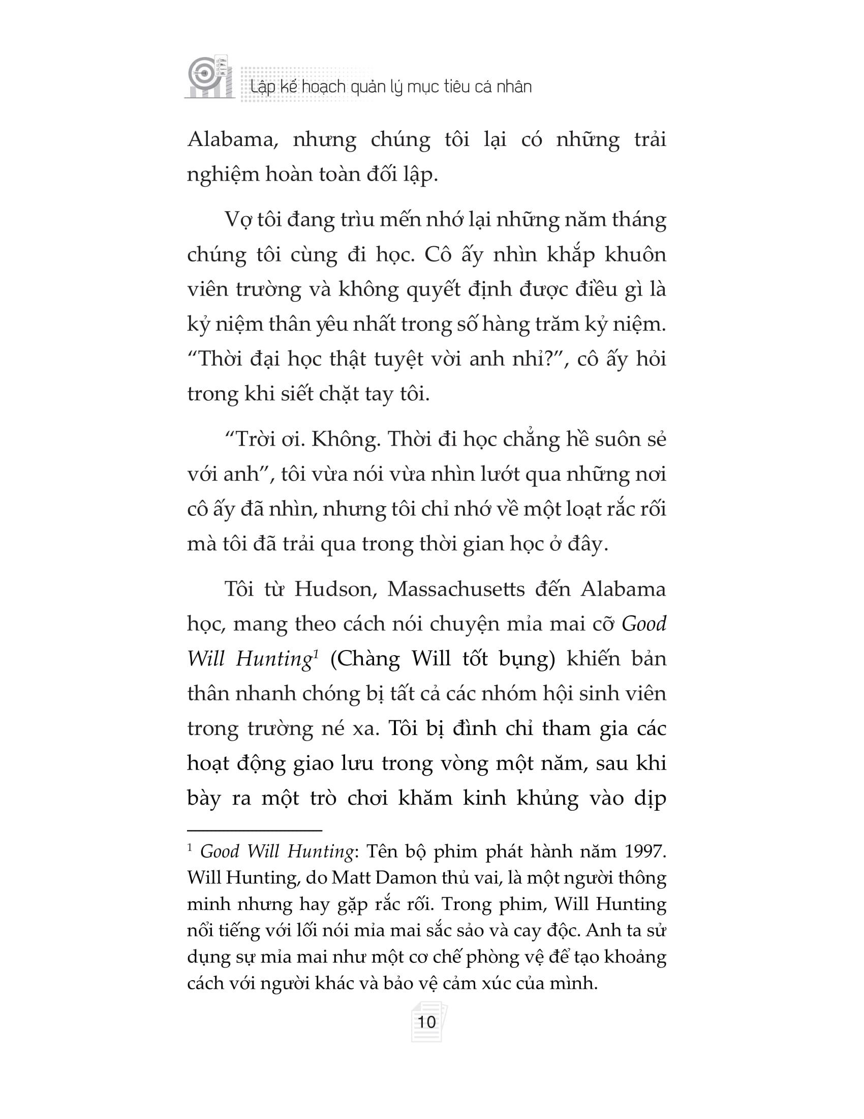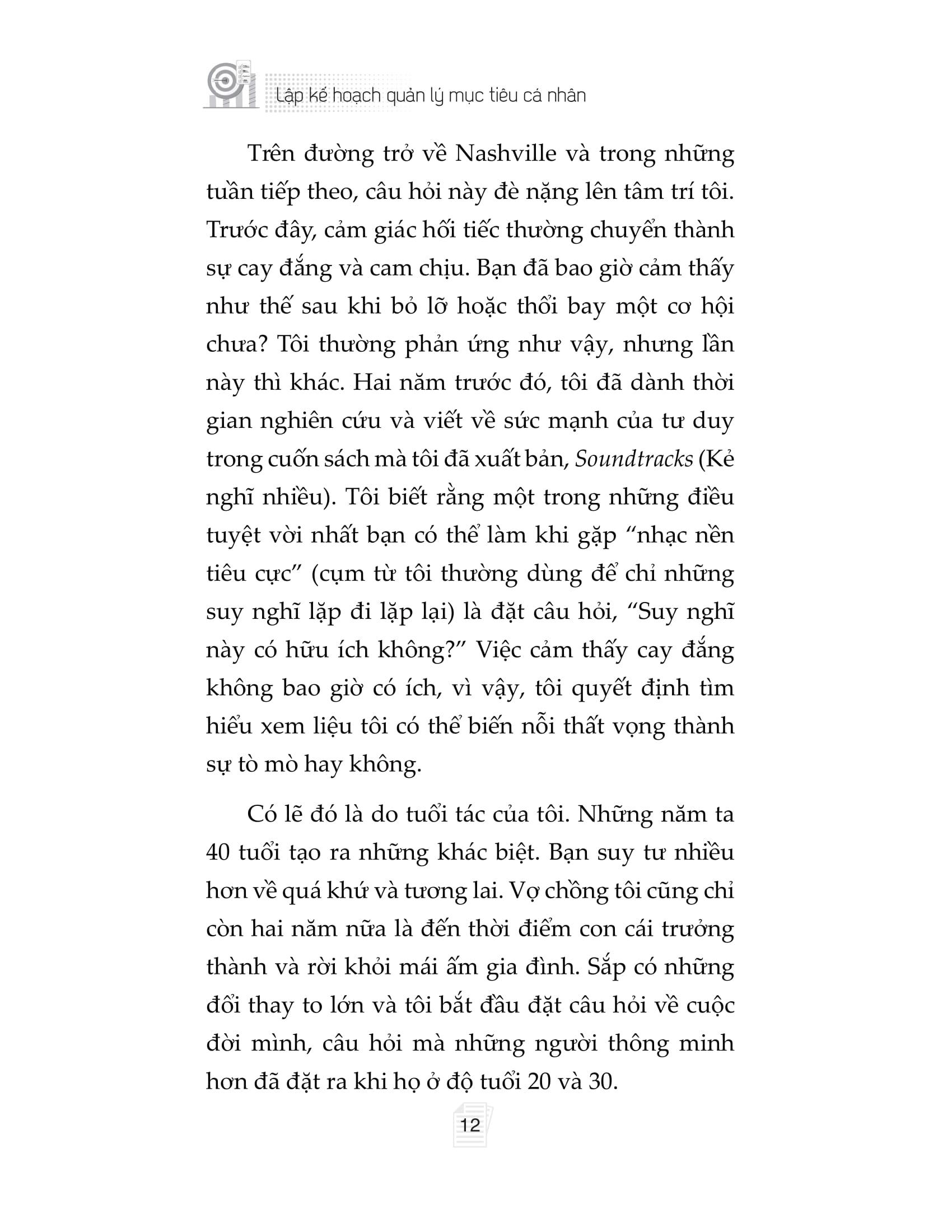 Cuốn sách “Lập kế hoạch quản lý mục tiêu cá nhân” viết ra nhằm hướng dẫn bạn cách thiết lập mục tiêu theo ba cấp độ để khai phá trọn vẹn tiềm năng của chính m.ình trong mọi khía cạnh cuộc sống (sự nghiệp, tài chính, mối quan hệ, sức khỏe và niềm vui). Với việc thiết lập mục tiêu hợp lý và có kế hoạch theo dõi tiến độ rõ ràng, bất kỳ ai áp dụng phương pháp của Jon Acuff cũng có thể duy trì năng lượng và động lực vô tận để vươn tới những mục tiêu to lớn, dài hạn và giàu ý nghĩa.