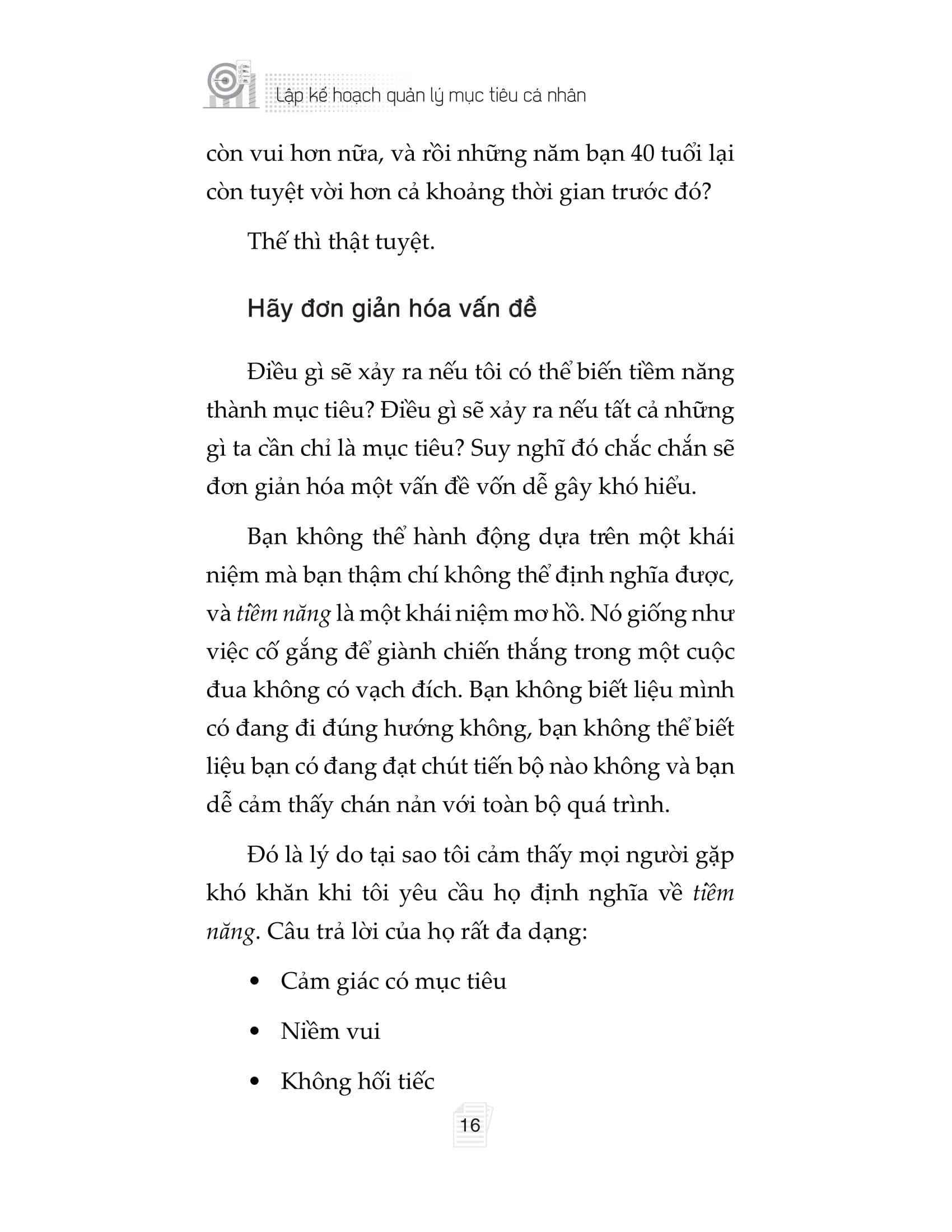 Với ba cấp độ mục tiêu (mục tiêu dễ dàng, mục tiêu trung bình và mục tiêu đảm bảo sẽ đạt được), tác giả vạch ra một con đường rõ ràng để ta kéo bản thân m.ình ra khỏi Vùng thoải mái trì trệ, tránh xa Vùng hỗn loạn luôn căng thẳng, để có thể tận hưởng những khoảnh khắc tuyệt vời trong Vùng tiềm năng.