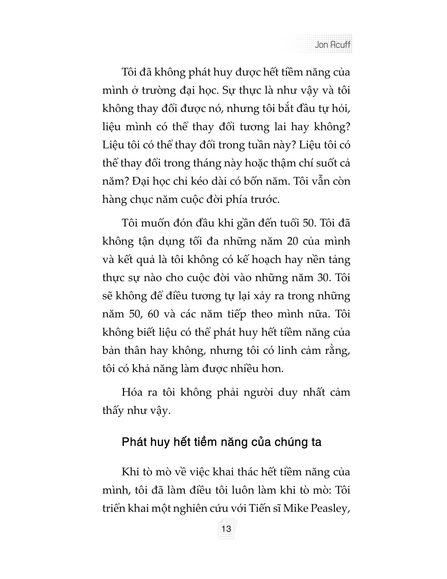Đặc biệt, bằng việc cung cấp các công cụ dễ áp dụng và hàng chục ví dụ thực tế về những con người thật, những câu chuyện thật, Jon Acuff không chỉ hướng dẫn ta cách bước vào Vùng tiềm năng, mà còn là sống lâu dài ở đó một cách bền bỉ, vui vẻ và đầy hứng khởi.