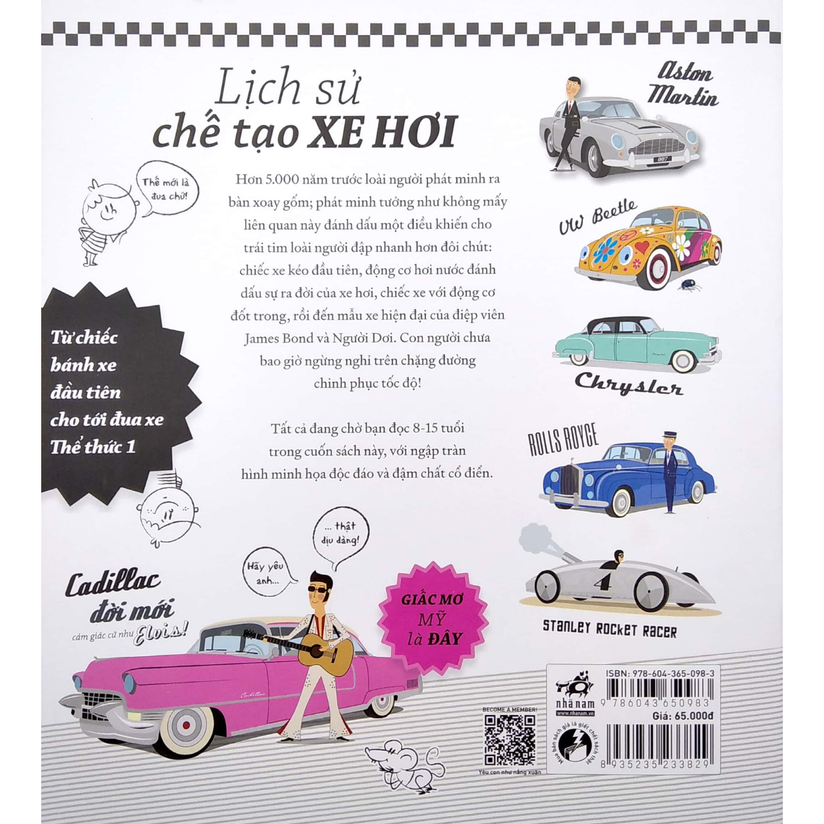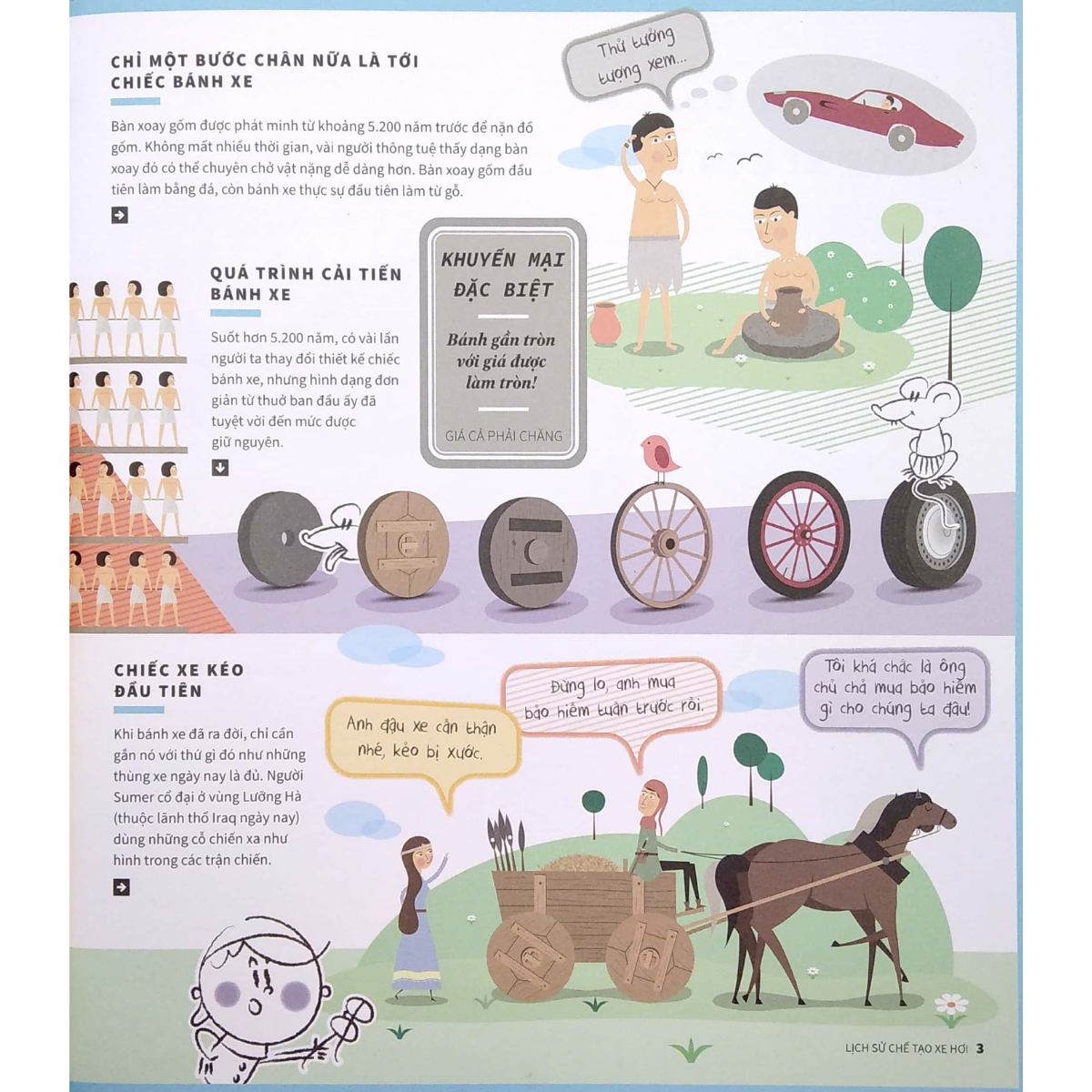 • Cuốn sách "Lịch Sử Chế Tạo Xe Hơi" đưa độc giả vào hành trình dài hơn 5.000 năm của sự phát minh và phát triển xe hơi. Từ những sáng chế ban đầu như bàn xoay gốm, qua việc chế tạo xe kéo, động cơ hơi nước, cho đến những cột mốc quan trọng như xe hơi với động cơ đốt trong, và cuối cùng là các mẫu xe hiện đại nổi tiếng như của James Bond và Người Dơi.