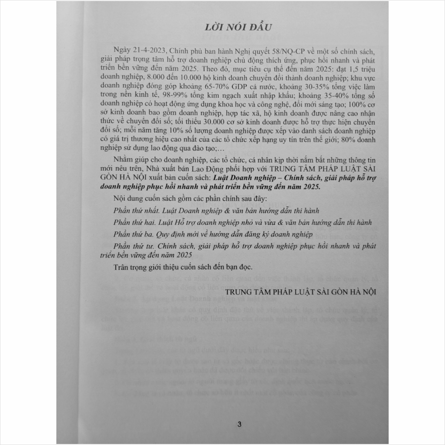 - Toàn bộ sách bìa mềm khổ lớn 20 x 28 cm phân phối bởi Nhà sách Nam Việt đều được bọc sách Plastic MIỄN PHÍ và xuất hóa đơn điện tử đầy đủ, nhanh chóng. …/… Lời giới thiệu: Ngày 21-04-2023, Chính phủ ban hành Nghị quyết 58/NQ-CP về một số chính sách, giải pháp trọng tâm hỗ trợ doanh nghiệp chủ động thích ứng, phục hồi nhanh và phát triển bền vững đến năm 2025. Theo đó, mục tiêu cụ thể đến năm 2025: đạt 1,5 triệu doanh nghiệp, 8.000 đến 10.000 hộ kinh doanh chuyển đổi thành doanh nghiệp; khu vực doanh nghiệp đóng góp khoảng 65-70% GDP cả nước, khoảng 30-35% tổng việc làm trong nền kinh tế, 98-99% tổng kim ngạch xuất nhập khẩu; khoảng 35-40% tổng số doanh nghiệp có hoạt động ứng dụng khoa học và công nghệ, đổi mới sáng tạo; 100% cơ sở kinh doanh bao gồm doanh nghiệp, hợp tác xã, hộ kinh doanh được nâng cao nhận thức về chuyển đổi số; tối thiểu 30.000 cơ sở kinh doanh được hỗ trợ thực hiện chuyển đổi số; mỗi năm tăng 10% số lượng doanh nghiệp được xếp vào danh sách doanh nghiệp có giá trị thương hiệu cao nhất của các tổ chức xếp hạng uy tín trên thế giới; 80% doanh nghiệp sử dụng lao động qua đào tạo;… Nhằm giúp cho doanh nghiệp, các tổ chức, cá nhân và Quý khách hàng thân thiết nắm bắt kịp thời những quy định mới nêu trên. Nhà sách Nam Việt xin trân trọng giới thiệu cuốn sách: Luật Doanh Nghiệp – Chính Sách, Giải Pháp Hỗ Trợ Doanh Nghiệp Phục Hồi Nhanh và Phát Triển Bền Vững Đến Năm 2025 …/… Nội dung cuốn sách gồm 4 phần sau đây: Phần thứ nhất. Luật Doanh nghiệp và văn bản hướng dẫn thi hành mới nhất Phần thứ hai. Luật Hỗ trợ doanh nghiệp nhỏ và vừa & văn bản hướng dẫn thi hành mới nhất Phần thứ ba. Quy định mới về hướng dẫn đăng ký doanh nghiệp Phần thứ tư. Chính sách, giải pháp hỗ trợ doanh nghiệp phục hồi nhanh và phát triển bền vững đến năm 2025 .../... Cảm ơn các bạn đã ghé thăm shop Nhà sách Nam Việt ! Sách Luật Doanh Nghiệp – Chính Sách, Giải Pháp Hỗ Trợ Doanh Nghiệp Phục Hồi Nhanh và Phát Triển Bền Vững Đến Năm 2025 Sách Luật Doanh Nghiệp – Chính Sách, Giải Pháp Hỗ Trợ Doanh Nghiệp Phục Hồi Nhanh và Phát Triển Bền Vững Đến Năm 2025