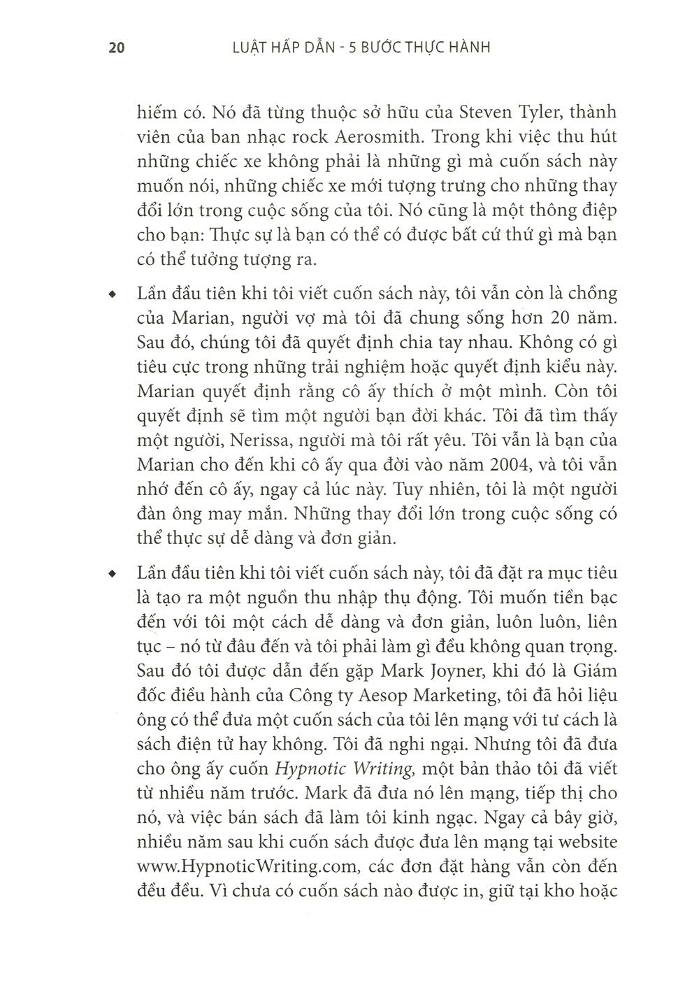Rất nhiều người cứ loay hoay tìm cách. Tôi ngày xưa cũng vậy. May thay, sau khi đọc xong cuốn Người nam châm – bí mật của luật hấp dẫn, tôi đã đọc ngay cuốn Luật hấp dẫn – 5 bước thực hành và nói thật hai cuốn sách này đã làm thay đổi tôi hoàn toàn. Vậy nên trong lần tái bản này tôi không thể không viết vài dòng về cuốn sách.