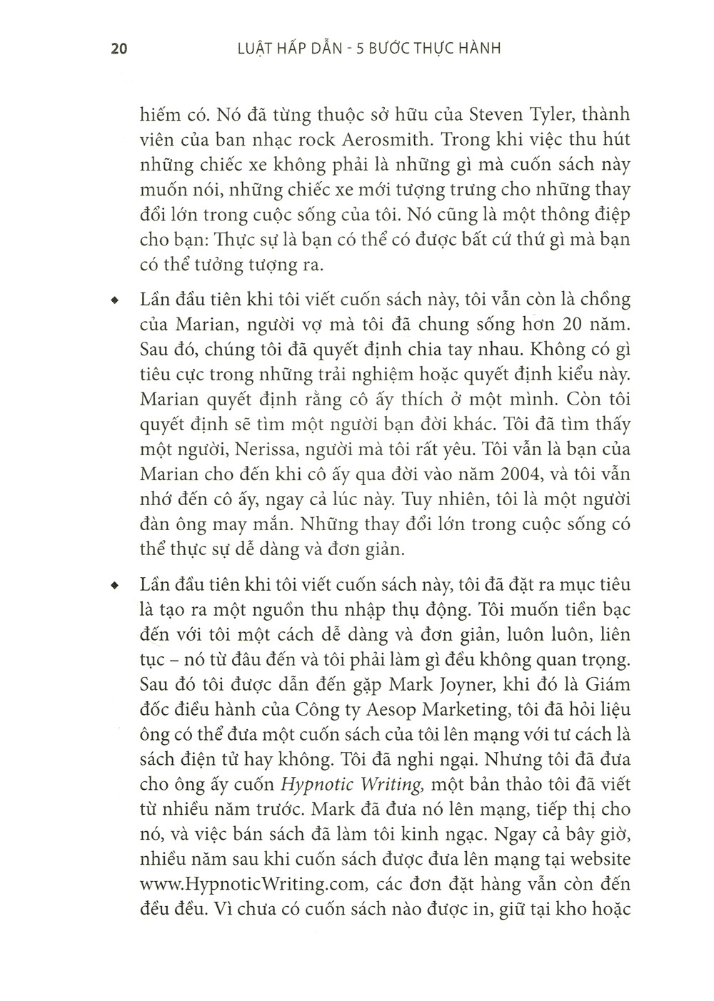 Luật Hấp Dẫn - 5 Bước Thực Hành "Tôi chưa từng gặp một ai không muốn thành công. Hơn thế nữa, mọi người đều mong muốn khám phá ra những bí mật của thành công để thành công nhanh nhất. Rất nhiều người cứ loay hoay tìm cách. Tôi ngày xưa cũng vậy. May thay, sau khi đọc xong cuốn Người nam châm - bí mật của luật hấp dẫn, tôi đã đọc ngay cuốn Luật Hấp Dẫn - 5 Bước Thực Hành và nói thật hai cuốn sách này đã làm thay đổi tôi  hoàn toàn. Vậy nên trong lần tái bản này tôi không thể không viết vài dòng về cuốn sách. Nếu như tôi đã từng bị cuốn sách Người nam châm thu hút bởi khi vận dụng luật hấp dẫn ta có thể thu hút thành công, hạnh phúc tới với mình thì Luật Hấp Dẫn - 5 Bước Thực Hànhđưa ra và phân tích sâu vào 5 bước phát triển bản thân và thực hiện việc hấp dẫn những gì chúng ta mong muốn trong cuộc sống. nói một cách khác,Luật Hấp Dẫn - 5 Bước Thực Hànhcụ thể hóa luật hấp dẫn vốn có sẵn trong vũ trụ. Tôi xin nhắc lại 5 bước cụ thể đó để bạn hình dung ra: Bước 1 Tìm hiểu những vấn đề tiêu cực ngăn cản thành công trong cuộc sống của bạn Bước 2: Dám ước mơ và tìm kiếm vận mệnh của chính mình Bước 3: Khám phá bí mật bị lãng quên trong quá trình tìm kiếm sự giàu có, thành công trong cuộc sống Bước 4: Hiện thực hóa mục tiêu Bước 5: Bí mật cuối cùng trở thành người có thể khiến vũ trụ mang đến cho bạn những thứ bạn mơ ước Tôi cũng được một số bạn bè và các cán bộ quản lý các danh nghiệp chia sẻ rằng, Luật hấp dẫn - 5 bước thực hành là bí quyết làm thay đổi đời họ. Nhờ có cuốn sách này, doanh nghiệp của họ lớn mạnh hẳn lên. Có người nhờ Luật hấp dẫn - 5 bước thực hành mà tìm thấy tình yêu như ý, người khác lại có được một sức khỏe tốt. Cá nhân tôi rất thích các bước cụ thể, rõ ràng trong cuốn sách. Từ ngày đọc xong tôi thấy mình hạnh phúc, bình an hơn rất nhiều, dễ dàng vượt mọi chông gai và khó khăn trong cuộc sống. Đối với tôi, Luật Hấp Dẫn - 5 Bước Thực Hành là một cuốn cảm nang vô cùng hữu ích, là chiếc chìa khóa mở ra những cánh của mới của cuộc đời. Hiện nay tôi thỉnh thoảng vẫn đọc lại cuốn sách để nhắc mình ứng dụng vào cuộc sống và công việc thường ngày. Hình như, nếu áp dụng triệt để những hướng dẫn có sẵn trong cuốn sách này, toàn thế giới sẽ được thay đổi."