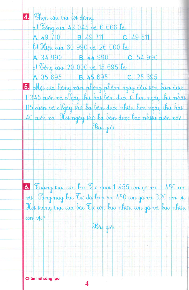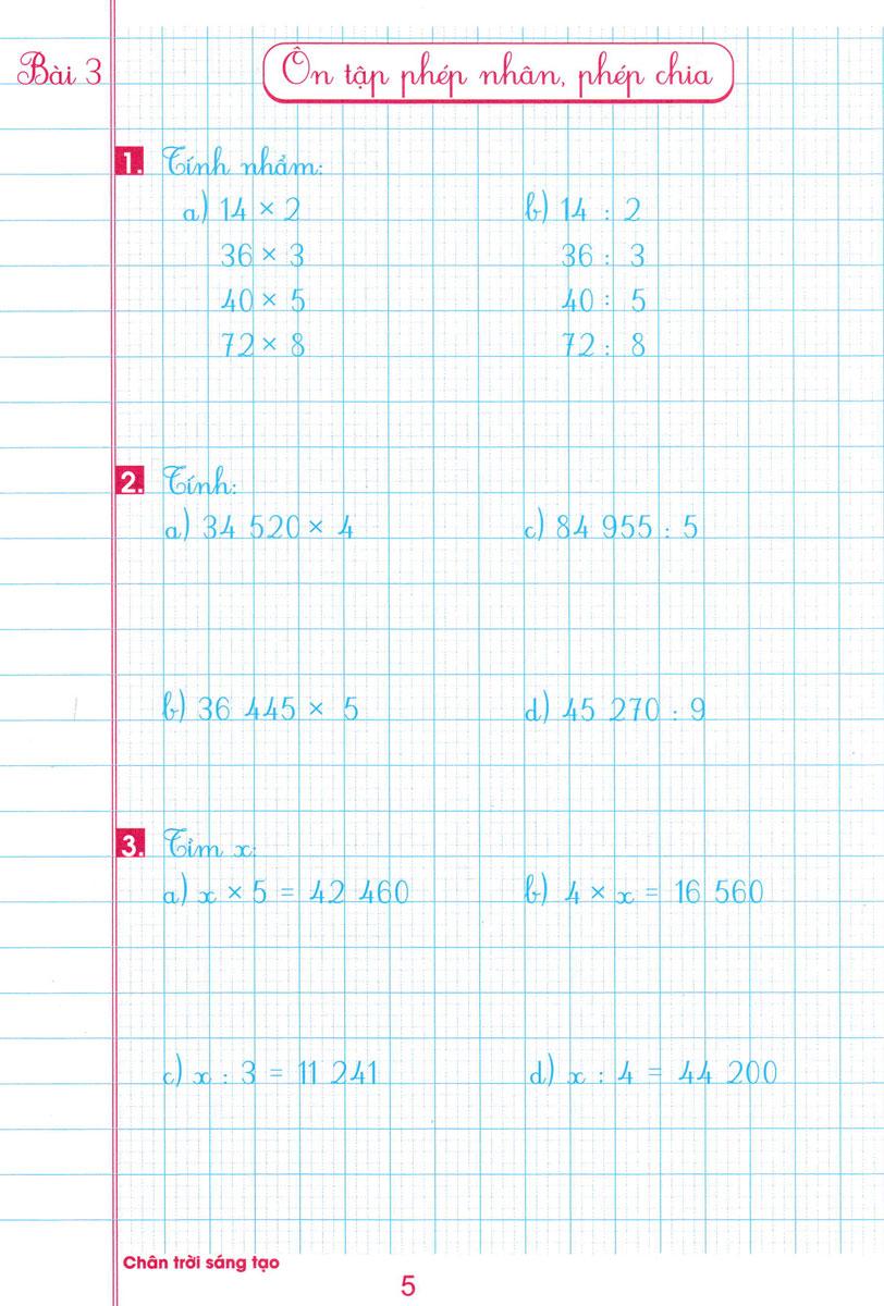 Luyện Tập Toán 4 - Trình Bày Trên Giấy Ô Li là cuốn sách do nhóm tác giả là những nhà giáo nhiều kinh nghiệm dạy ở các trường Sư phạm và chuyên viên phụ trách môn Toán tiểu học biên soạn theo chuẩn kiến thức, kĩ năng của SGK Chân Trời Sáng Tạo của Bộ Giáo dục và Đào tạo, với mục đích:
