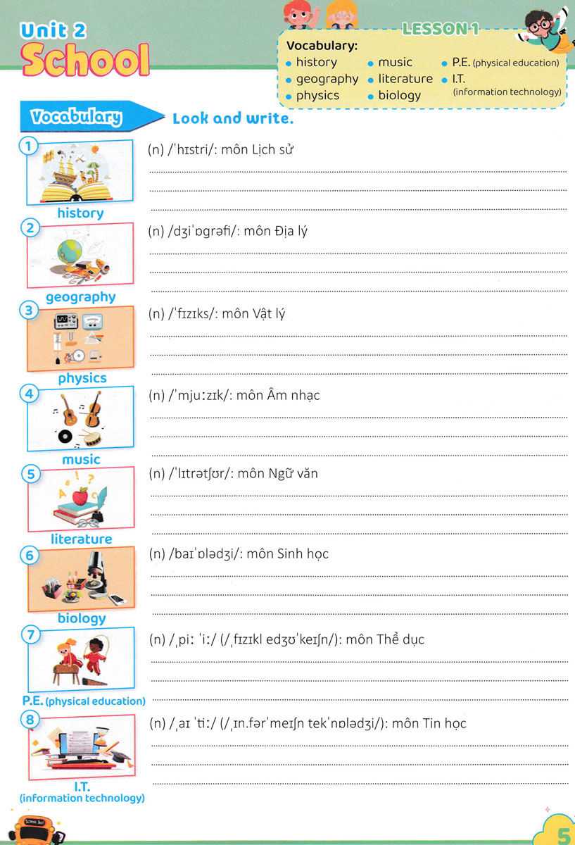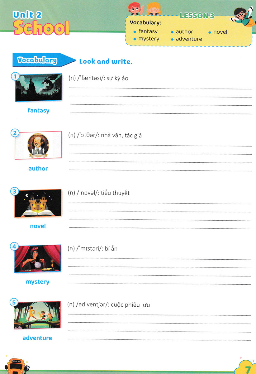 Từ đó, các em có thể sử dụng từ để xây dựng câu trong hoạt động giao tiếp, cũng như giải quyết các bài tập về từ vựng, ngữ pháp… Các em sẽ luyện viết và học từ tiếng Anh bằng các hình ảnh minh họa sinh động. Sau phần luyện từ vựng là các hoạt động chọn từ đúng, điền từ, ghép từ với hình thích hợp, sắp xếp từ, Sau mỗi đơn vị bài học có phần ôn tập (Review) với các hoạt động lý thú giúp các em củng cố kiến thức. Thông qua các hoạt động này các em sẽ cảm thấy hứng thú và tích cực hơn trong quá trình học tập môn Tiếng Anh.