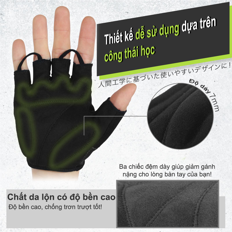 Thông tin cơ bản: - Loại sản phẩm: Găng tay nửa ngón. - Chức năng: Chống trượt, chống mồ hôi. - Kích thích lòng bàn tay: 9-11 cm. - Chất liệu: sợi mịn, bọt biển