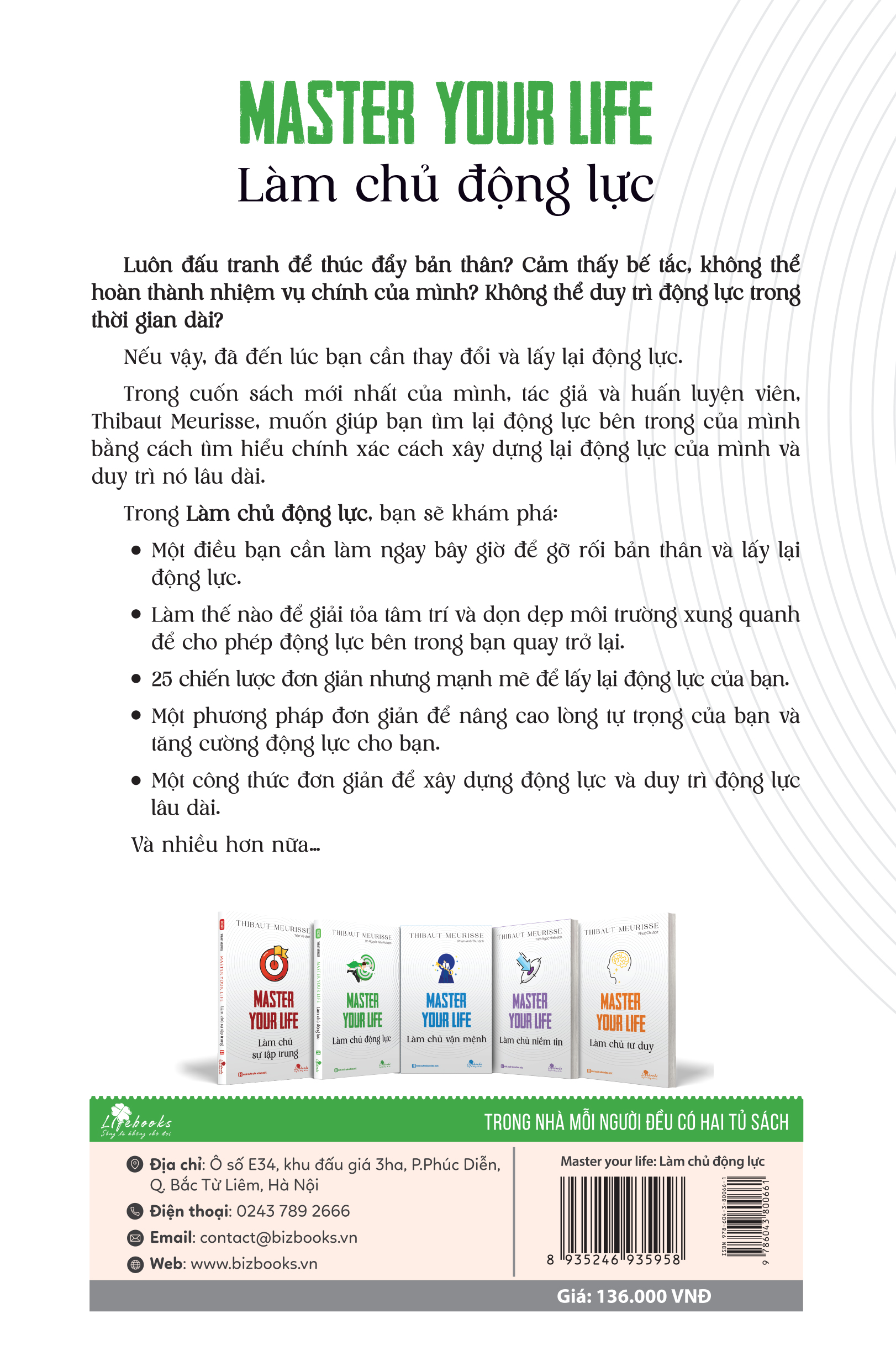 Cuốn sách Master your life - Làm chủ động lực sẽ giúp bạn thoát khỏi trình trạng suy sụp và xây dựng lại động lực cho bản thân. Khi bạn áp dụng những điều mình học được từ cuốn sách này, bạn sẽ tạo được động lực và phát huy sự nhất quán trong cuộc sống. Động lực của bạn sẽ tăng lên và kết quả là bạn sẽ đạt được nhiều mục tiêu hơn bạn tưởng. Nội dung cuốn sách Master your life - Làm chủ động lực chia làm 4 phần: