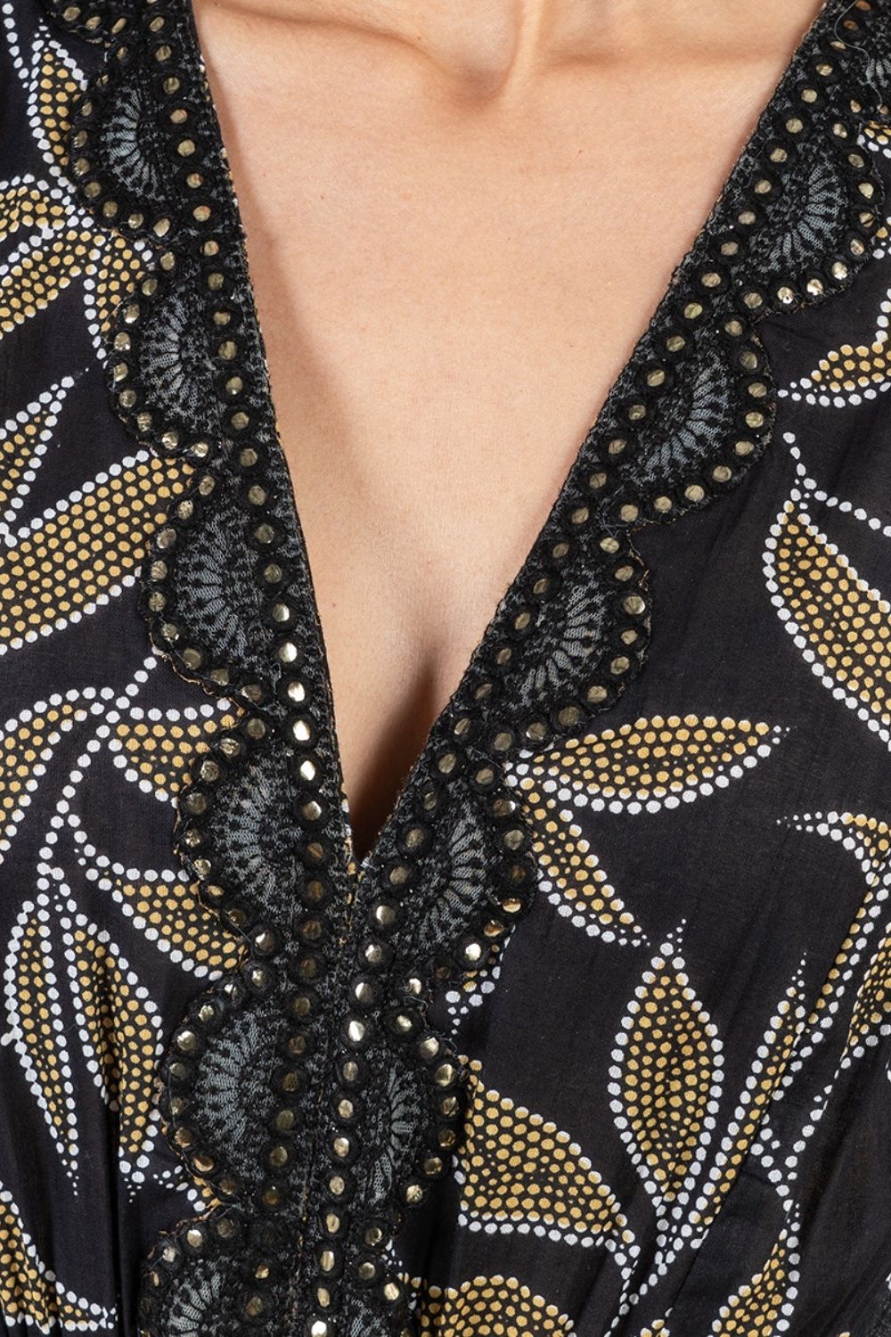 Maxi Hoa Kết Hạt Ánh Bạc Cotton Isla Bonita, chất liệu cotton mềm mại cao cấp, nổi bật phần ren phối trước ngực kết ánh bạc tinh tế, nổi bật, họa tiết hoa vàng trên