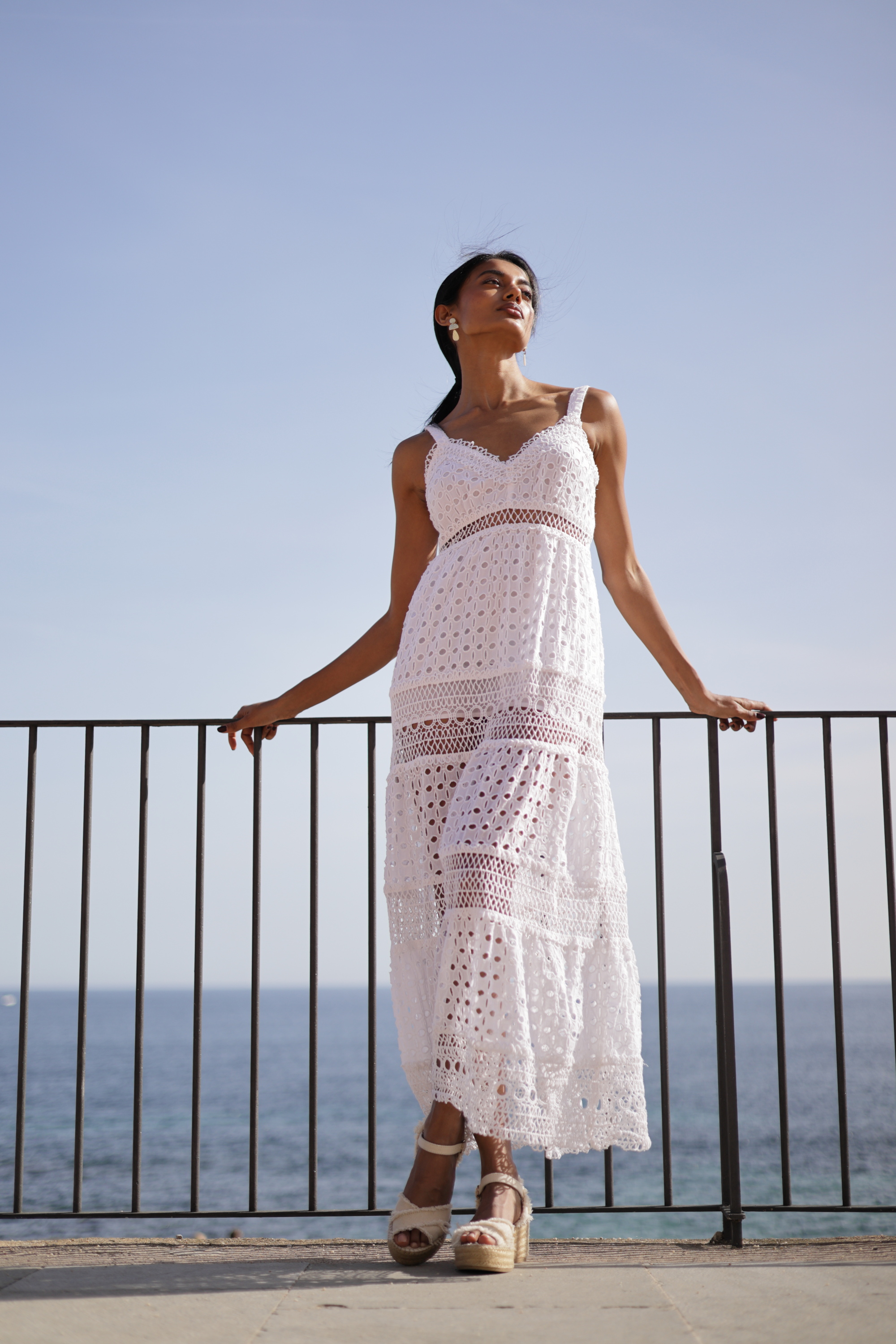 Maxi Trắng Phối Ren Cotton Cao Cấp, chất cotton mềm mại cao cấp. Nền vải lazer cut tạo lỗ ren tinh tế, kết hợp phối ren sang trọng giữa các tầng váy. Phần lưng sau