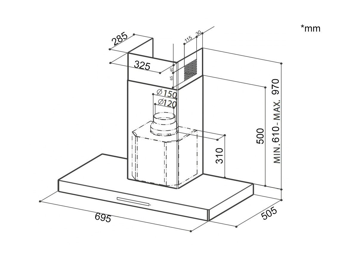 Chất liệu Inox - kính 6mm Điều khiển bằng phím cảm ứng Đèn báo sáng đang hoạt động Ống thoát Ø150mm Đèn Led tiết kiệm điện: 2Wx2 Bộ lọc 1 than hoạt tính và 2