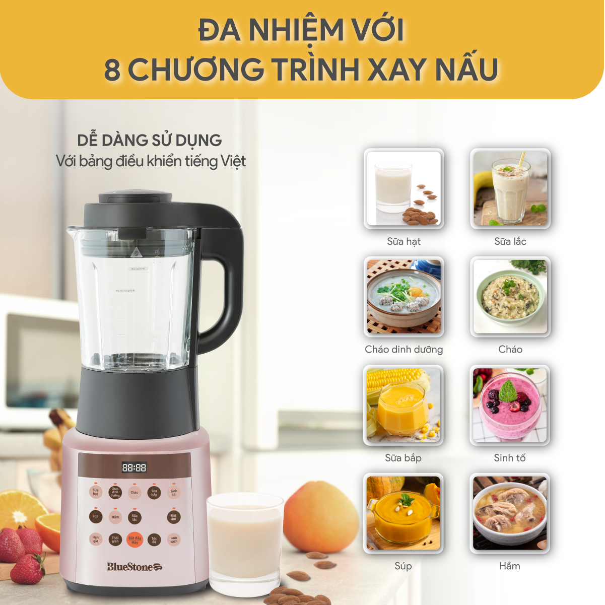 - Bảng điều khiển - Chương trình cài đặt sẵn Bảng điều khiển nút nhấn tiếng Việt với menu in hình hiển thị rõ ràng, trực quan cho bạn thuận tiện quan sát và thao tác trên máy. Sản phẩm có tích hợp thêm nút tăng, giảm thời gian và tốc độ xay, giúp người dùng linh hoạt điều chỉnh thủ công phù hợp với từng loại nguyên liệu. Máy làm sữa hạt đa năng BlueStone trang bị 10 chương trình cài đặt sẵn, gồm 8 chương trình xay-nấu: Sữa hạt, Cháo dinh dưỡng, Cháo, Sữa bắp, Sinh tố, Súp, Hầm, Sữa lắc và 2 chế độ Giữ ấm - Hẹn giờ giúp người dùng dễ dàng lựa chọn chương trình phù hợp với nhu cầu và nguyên liệu chế biến. Bên cạnh đó, người dùng cũng có thể tự điều chỉnh công suất và thời gian phù hợp nhu cầu của bản thân và gia đình.