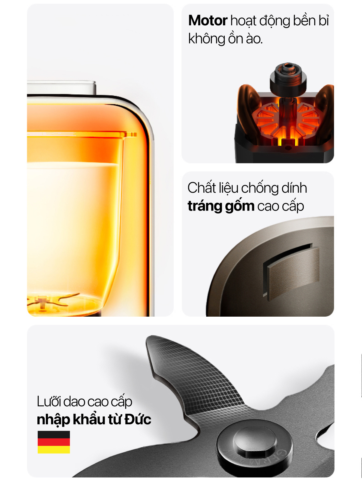 Điện áp : 220-240V/50Hz Năng lượng : A+ Công suất : 500W Lưỡi dao : 10 INOX 304 Dung tích: 800ml Điền khiển : cảm ứng tiếng việt Phụ kiện : Cốc đo, cốc hâm,