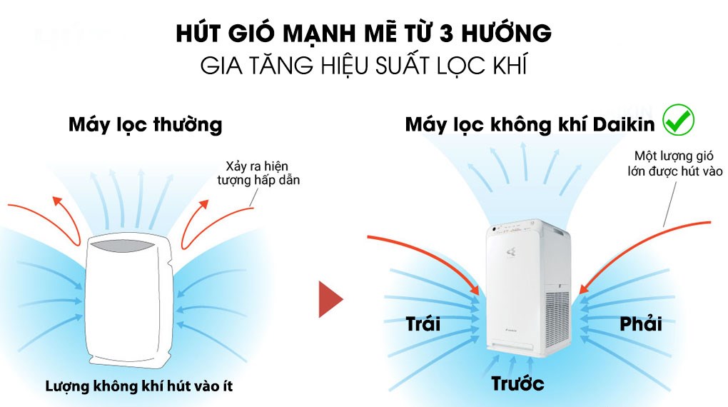 - Không bị trộn lẫn khí bẩn vào luồng khí sạch: Thiết kế của miệng hút gió bẩn cách xa và tách biệt với miệng trả gió, giúp giảm tối thiểu lượng khí bẩn bị trộn lẫn với luồng không khí sạch thổi ra khỏi máy. Hệ thống hút gió mạnh mẽ từ 3 hướng, giúp nhanh chóng hút sạch bụi bẩn vào hệ thống lọc thải, trả lại bầu không khí trong lành cho căn phòng bạn Máy lọc không khí với thiết kế 3 miệng hút gió (phía trước - bên trái - bên phải), cho phép hút vào một lượng lớn không khí, từ đó nhanh chóng làm sạch không khí trong phòng, gia tăng hiệu suất lọc khí. Nhờ vào thiết kế 3 hướng hút, bạn có thể đặt máy sát tường mà vẫn đảm bảo hiệu suất lọc khí đạt mức tối ưu được trang bị cảm biến "3 chức năng" thông minh, nhanh chóng phát hiện bụi mịn PM2.5, bụi thường và mùi hôi Máy lọc không khí được trang bị cảm biến độ nhạy cao, phát hiện nhanh chóng bụi thô và bụi mịn PM2.5, giúp người dùng theo dõi được mức độ ô nhiễm không khí, từ đó tìm ra phương pháp xử lý phù hợp cho không gian sống của mình. Loại bỏ ô nhiễm không khí qua 3 bước lọc mạnh mẽ