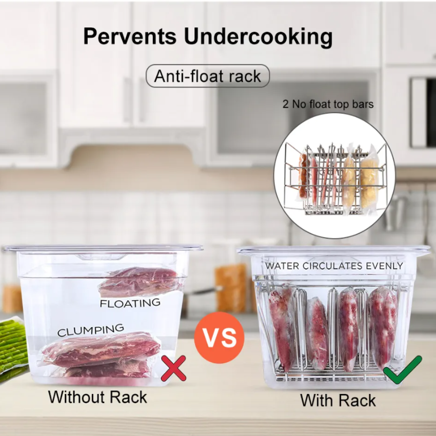- Đảm bảo được màu sắc tự nhiên, vẻ thẩm mỹ của thực phẩm; gia tăng hiệu quả nấu ăn - Chất lượng ổn định, an toàn suốt quá trình nấu Giới thiệu máy nấu chậm Sous Vide BioloMix SV-8006 siêu MỚI Thế hệ thứ 2,5 công suất cao tối đa 1200 watt cho thời gian nấu và làm nóng trước chắc chắn nhanh hơn rất nhiều so với các loại Sous vide khác có trên thị trường chỉ sử dụng 800 watt hoặc 1000 watt Nấu ăn như một Cheef Pro – Bộ nấu ăn mới Biolomix Sous vide SV-8006 mới cho phép bạn nấu một bữa ăn chất lượng như nhà hàng tại nhà. Bếp Sous Vide của chúng tôi là thiết bị nhà bếp hoàn hảo để nấu các loại rau, thịt và hơn thế nữa với khả năng kiểm soát nhiệt độ nấu nhất quán và chính xác. Điều chỉnh nhiệt độ và hẹn giờ chính xác – Bảng điều khiển Hẹn giờ-Kỹ thuật số chính xác giúp nhiệt độ chính xác đến ± 0,1 ℃. Phạm vi nhiệt độ đa dạng (từ 0 ° C đến 90 ° C) và kiểm soát thời gian cho phép bạn nấu bất kỳ loại thực phẩm nào bạn thích. Chế độ nấu bằng Sous vide ngăn chặn tối đa mất nước cần thiết và giữa lại hương vị cho món ăn. Dễ đáng sử dụng và vệ sinh – Chỉ cần gắn nồi vào bất kỳ nồi nào, thêm nước, cho các nguyên liệu của bạn vào túi hút chân không. Bắt đầu nấu chỉ với một nút bấm trên thiết bị. Chế độ hẹn giờ và kiểm soát nhiệt độ của nồi Sous vide cho phép bạn thư giãn trong khi nấu ăn, các phần tiếp xúc nước bằng thép không gỉ có thể tháo rời của bếp sous vide an toàn và vệ sinh dễ dàng, thiết bị nhà bếp này dễ dàng vệ sinh và bảo trì. Làm nóng nhanh