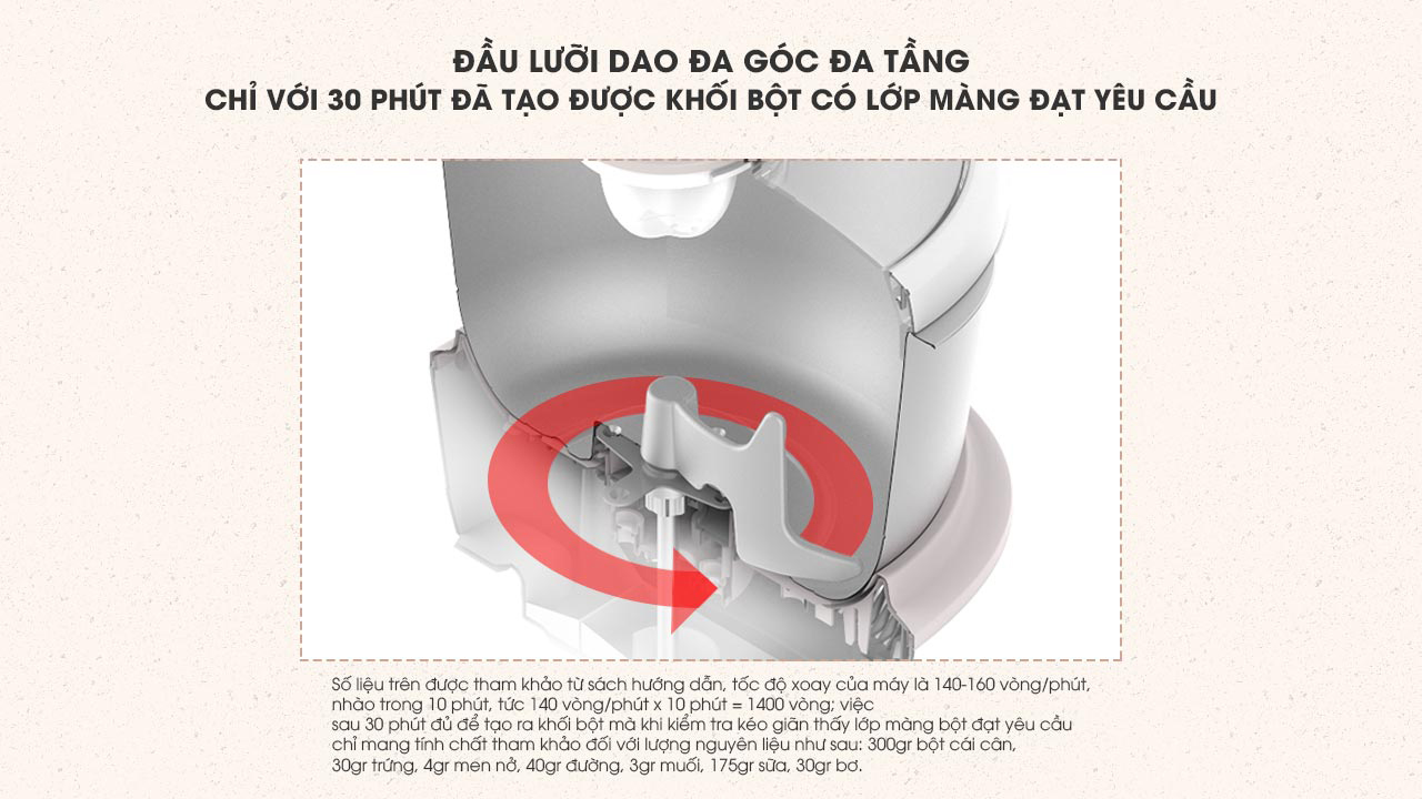 - trang bị 3 đầu trộn bằng thép không gỉ siêu bền, siêu an toàn cho phép người dùng có thể nhào bột làm bánh, đánh kem, đánh trứng, quết giò/chả, một cách mịn, nhuyễn nhất.