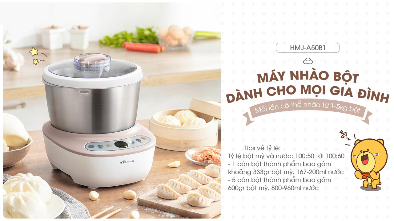 Máy nhào bột tự động Bear HMJ-A50B1 dung tích 5L Máy nhào bột tự động Bear HMJ-A50B1 với 5L có thể nhồi tối đa khoảng 2.5kg bột khô. Sản phẩm có thiết kế cải tiến nhỏ gọn, dung tích lớn, âu bằng inox, sáng sạch, không lo rò điện, màn hình led điện tử hiển thị thời gian nhồi và ủ rõ ràng. Máy nhào bột tự động Bear HMJ-A50B1 5L Thông tin về sản phẩm