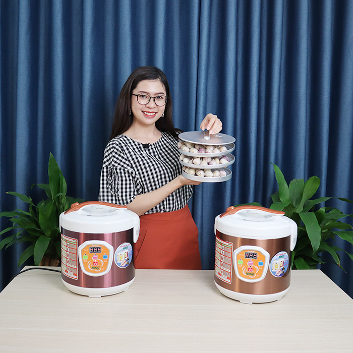 - Chu trình lên men tỏi cô đơn: Thời gian 240 giờ (10 ngày), 264 giờ (11 ngày), 288 giờ (12 ngày), 312 giờ (13 ngày), 336 giờ (14 ngày), 360 giờ (15 ngày). Đây là tính năng mới nhất chỉ có ở dòng nồi Nikio NK-686, giúp nâng cao tỉ lệ thành công, cho tỏi đen chất lượng 100%. Cả 2 chu trình đều được lập trình lên men hoàn toàn tự động và rất an toàn. Sấy khô tự động, và tùy chỉnh thời gian sấy Nồi làm tỏi đen Nikio NK-686 có khả năng tự động sấy khô tỏi ở những thời gian cuối quy trình lên men. Điểm đặc biệt ở dòng sản phẩm này là, nó cho phép người dùng cân chỉnh được thời gian sấy khô tỏi từ 4 giờ, 8 giờ hoặc 12 giờ. Tùy vào mẻ tỏi thành phẩm ra sấy hay không nên sấy và sấy trong thời gian bao lâu. Tính năng này giúp cho tỏi đen làm ra từ nồi luôn thơm ngon đúng tiêu chuẩn chất lượng của tỏi đen Nhật Bản. Bạn sẽ hoàn toàn tự tin khi sử dụng nồi làm tỏi đen của Nikio. Dung tích lớn 6 lít làm tới 2kg tỏi tươi Nồi làm tỏi đen Nikio có dung tích 6L, lớn vượt trội hơn so vưới các dòng nồi làm tỏi đen hiện tại trên thị trường. Thiết kế với 3 khay chứa tỏi riêng biệt, bạn có thể điều chỉnh độ cao của khay theo độ cao của tỏi côc đơn và tỏi nhiều nhánh. Bạn có thể làm được 1.8kg tới 2kg tỏi tươi. Thật tiện lợi phải không ạ. Thời gian tự động đếm ngược Máy làm tỏi đen Nikio NK-686 có màn hình hiển thị LCD giúp bạn dễ dàng theo dõi nhiệt độ. Trong quá trình lên men, thời gian lên men tỏi sẽ được máy làm tỏi đen Nikio tự động đếm ngược và hiển thị trên LCD. Giup bạn bám sát được quá trình lên men một cách hiệu quả. Chức năng ghi nhớ khi mất điện IC của máy làm tỏi đen Nikio Nikio NK-686 sẽ tự động ghi nhớ chế độ làm việc trước khi mất điện. Sau khi nguồn điện AC trở lại bình thường. IC sẽ tự động khôi phục lại chế độ làm việc trước khi mất điện. Tính năng này giúp đảm bảo được quy trình lên men và cũng nâng cao tỷ lệ thành công trong quá trình lên men. Chất liệu cao cấp Lòng nồi được làm bằng hợp kim nhôm, xoong nồi dày giúp cho việc lưu trữ nhiệt lâu, lên men tỏi tốt hơn. Lồng nồi được tráng phủ 2 lớp men chống dính cho khả năng truyền nhiệt tốt giúp cho quá trình lên men tốt hơn, cũng như dễ dàng hơn trong quá trình vệ sinh nồi. Thân nồi được làm bằng nhôm cao cấp, chịu được va vập và có độ bền cao. Các khay chứa tỏi (các tầng) được làm bằng hợp kim nhôm cao cấp, không gỉ nên rất an toàn. Màu sắc sang trọng và bắt mắt Công nghệ sơn tỉnh điện giúp cho nồi làm tỏi đen Nikio nhìn sang trọng và bắt mắt hơn. Dòng nồi làm tỏi đen Nikio Nikio NK-686 có 2 màu là cafe sữa và đỏ tím sang trọng và bắt mắt. Nồi làm tỏi đen Nikio sẽ tô điểm thêm cho không gian bếp của bạn trở nên hiện đại và lộng lẩy hơn bao giờ hết. Thông số kỹ thuật Nồi Làm Tỏi Đen NIKIO: Model: NK-686, model tùy chỉnh Thương hiệu: NIKIO Công nghệ sản xuất: Nhật Bản Công suất: 90W (max) Khay chứa tỏi: 3 tầng Làm được: 1.8kg tới 2kg tỏi tươi Chất liệu khay: Hợp kim nhôm Điện áp: 220-240V Tần số: 50/60Hz Dung tích: 6 lít Kích thước thùng: 300x300x335mm Trọng lượng nguyên thùng: 3,5kg Làm được tỏi cô đơn và tỏi nhiều nhánh và có thể tùy chỉnh thời gian làm: