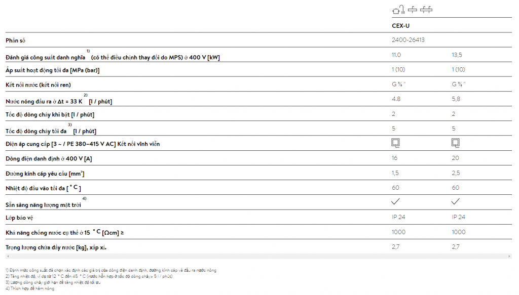 CEX-U với công nghệ điều khiển điện tử đảm bảo an toàn và tiết kiệm năng lượng. Nước nóng sẵn sàng sử dụng ngay sau vài giây kể từ khi mở van nước. Điều khiển và kiểm soát trực quan thông qua màn hình LED cùng các phím bấm cảm ứng và điều khiển từ xa. Tùy chọn nâng cấp với điều khiển qua app trên điện thoại thông minh Máy nước nóng tức thì CLAGE CEX-U với các đặc điểm nổi bật: –  Điều khiển điện tử đảm bảo an toàn và tiết kệm – Thiết kế nhỏ gọn, dễ dàng lắp đặt và tiết kiệm không gian –  Điều khiển và theo dõi trực quan qua màn hình LED cảm ứng hoặc điều khiển từ xa – Tùy chọn nâng cấp điều khiển trên smatrphone qua app Smart Control – Cài đặt nhiệt độ đầu ra chính xác từ 20°C đến 60°C (Từ 35°C đến 43°C có thể cài đặt theo khoảng chia 0,5°C) – Có thể lập trình và ghi nhớ cho nhiệt độ đặt trước / giới hạn nhiệt độ tùy chọn hay các chỉ báo chức năng. – Nước ấm sẵn sàng và chính xác nhiệt độ giúp không cần thiết pha thêm nước lạnh khi dùng – Công nghệ kiểm soát NHIỆT ĐỘ TWIN TTC cho nhiệt độ chính xác trong khoảng công suất – Công nghệ đun nóng dùng dây trần IES đảm bảo tuổi thọ cao, ít cặn vôi, hiệu quả và dễ bảo trì – Với Hệ thống đa công suất MPS, định mức công suất tối đa được đặt tại thời điểm lắp máy Với công nghệ điều khiển điện tử, CEX-U đảm bảo cung cấp nước nóng ổn định và tiết kiệm năng lượng. Nước được làm nóng trực tiếp đến nhiệt độ cài đặt trước mong muốn ngay khi chảy qua thiết bị. Nhiệt độ được chọn bằng cách nhấn một trong các nút trên bảng LED, với cài đặt gốc được lập trình ở 35°C và 48°C. Máy nước nóng tức thì điện tử với thiết kế nhỏ gọn để dễ dàng lắp đặt dưới bồn rửa Điều khiển trực quan – Dễ dàng kiểm soát Bảng điều khiển nút nhấn với màn hình LED để cài đặt nhiệt độ chính xác từ 20°C đến 60°C Trong vùng thoải mái từ 35 ° C đến 43 ° C, nhiệt độ có thể được cài đặt theo mức tăng 0,5 độ Hai nút lập trình cho nhiệt độ đặt trước riêng lẻ, giới hạn nhiệt độ tùy chọn cũng như các chỉ báo chức năng, điều này giúp người dùng không cần pha thêm nước lạnh khi sử dụng. Nước ấm đảm bảo nhiệt độ cài đặt để dùng ngay. Dễ dàng lắp đặt dưới bồn rửa nhà bếp hoặc ẩn trong các hốc tủ bếp nhờ kích thước nhỏ và đầu nối nước ren ngoài ⅜ ” Bộ kết nối (cút nối chữ T và ống mềm nối dài) cho một van góc đã được bao gồm trong gói phụ kiện đi kèm máy Nhiệt độ chính xác do kiểm soát NHIỆT ĐỘ TWIN TTC Hệ thống đun nóng dùng dây trần IES đảm bảo tuổi thọ cao hơn, ít cặn bẩn hơn, hiệu quả và dễ bảo trì Với Hệ thống đa công suất MPS, định mức công suất tối đa được đặt tại thời điểm lắp đặt máy Cũng có thể được điều khiển bằng máy tính bảng hoặc điện thoại thông minh (từ iOS 9 / Android-OS 4.4) (điều này yêu cầu bộ điều hợp radio FXE3 (C) và ứng dụng “Smart Control”) Hệ thống năng lượng mặt trời tương thích (nhiệt độ cung cấp ≤ 60 ° C) Kích thước (cao × rộng × sâu): 29,4 × 17,7 × 10,4 cm Thông số kỹ thuật: