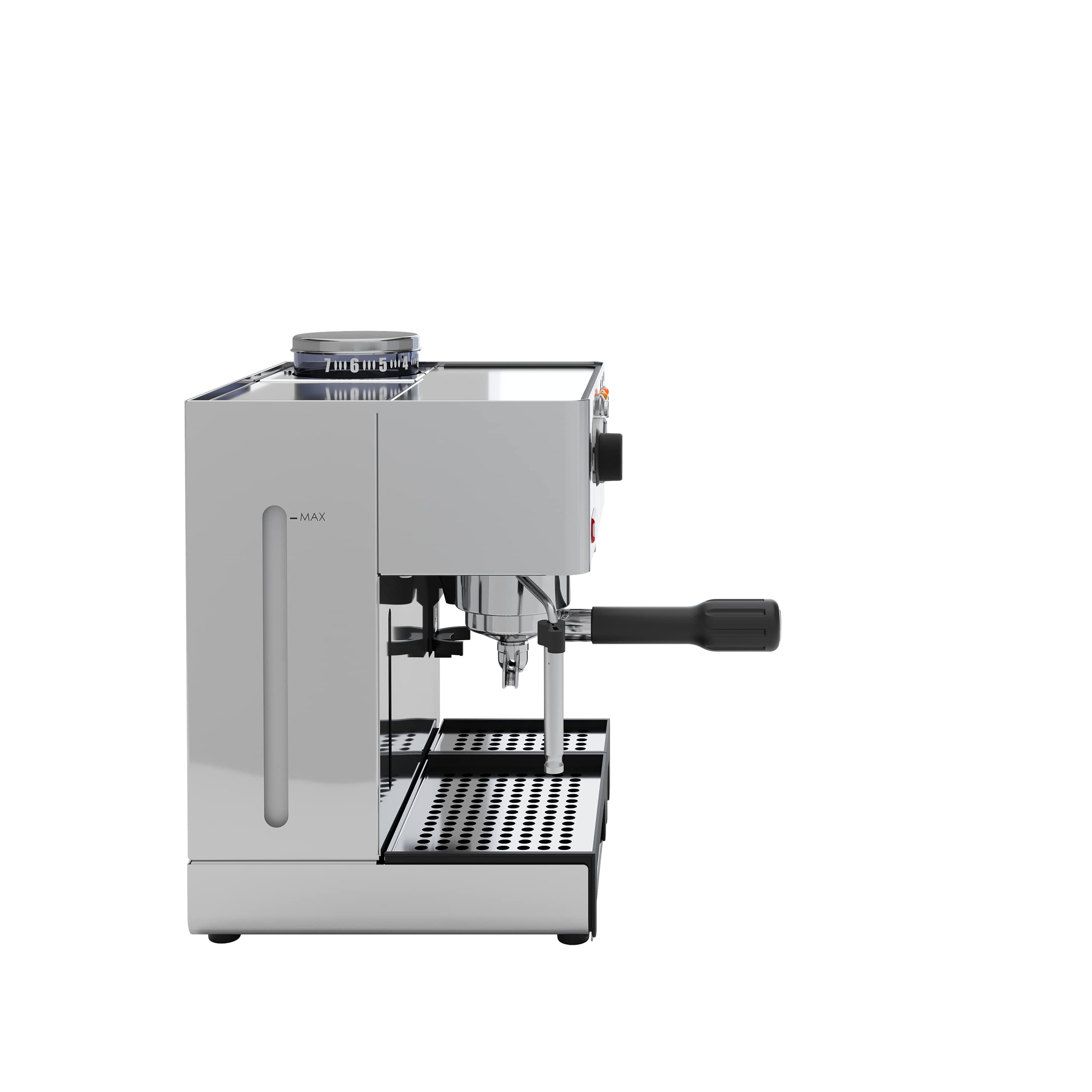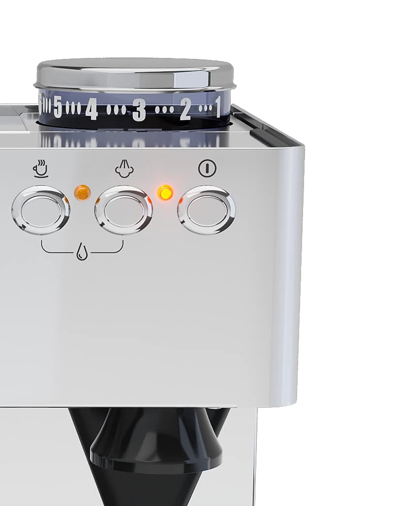 Máy có tay cầm cà phê chuyên nghiệp làm từ hợp chất kim loại crom dày, giữ nhiệt tốt cho lớp crema dày mịn. Hê thống nhiệt bảo vệ cho van điều khiển áp lực tốt hơn. Phin lọc 57 mm sử dụng được với cà phê rang xay hoặc cà phê viên nén pod E.S.E.