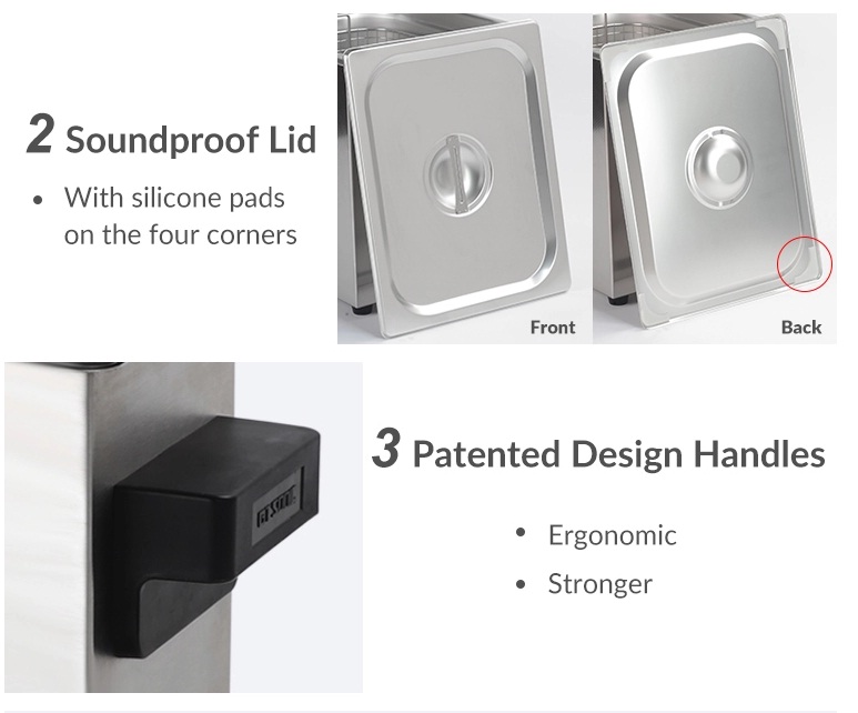 Được trang bị giỏ inox, nắp đậy chống ồn, có vòi xả nước, giúp bảo vệ máy rửa tốt hơn, đồng thời hỗ trợ việc lấy mẫu ra đơn giản, dễ dàng, đảm bảo an toàn cũng như hạn chế mẫu dung dịch rơi ra ngoài
