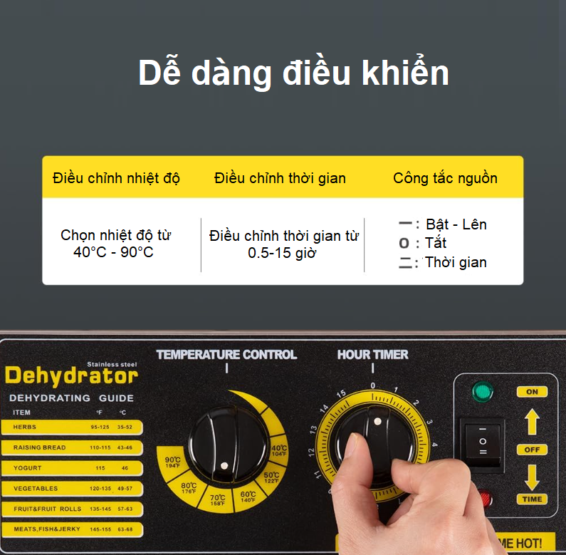 Điểm nổi bật - Sấy trái cây, rau, nấm, rau thơm, thịt, - Cài đặt nhiệt độ thay đổi từ 30 đến 70 ° C - Hẹn giờ lên đến 24 giờ, công tắc tự