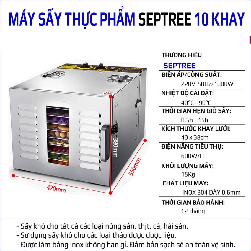 - Máy sấy Septree 10 khay, có phạm vi nhiệt độ sấy vào khoản từ 30 độ C đến 90 độ C, có thể sử dụng để sấy khô, sấy dẻo hầu hết các loại nông sản, hoa quả, thực phẩm có kích thước phù hợp với công suất thiết kế của máy.