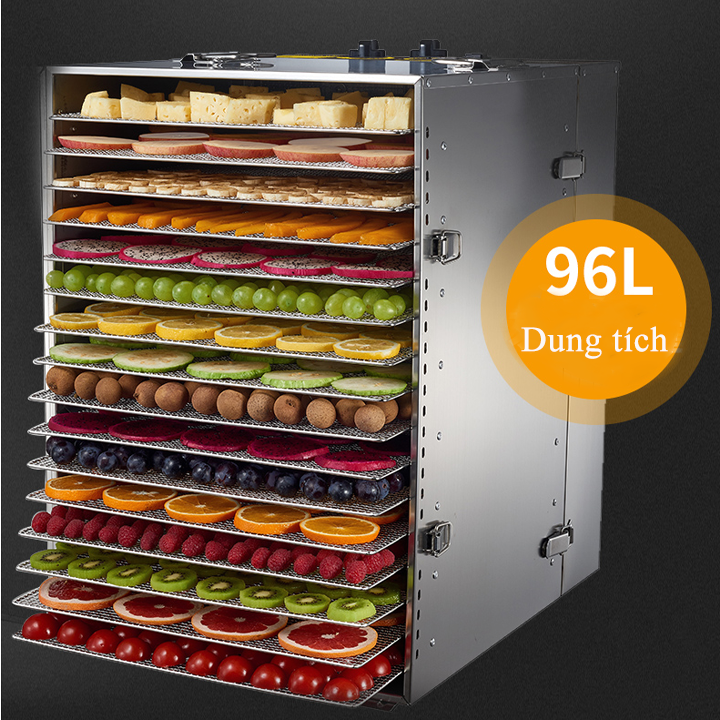 - Chất liệu 100% inox an toàn cho sức khỏe và độ bền cao. Cửa được lắp thêm kính cường lực dễ dàng quan sát thực phẩm sấy bên trong với phiên bản Máy sấy thực phẩm Inox 16 khay này