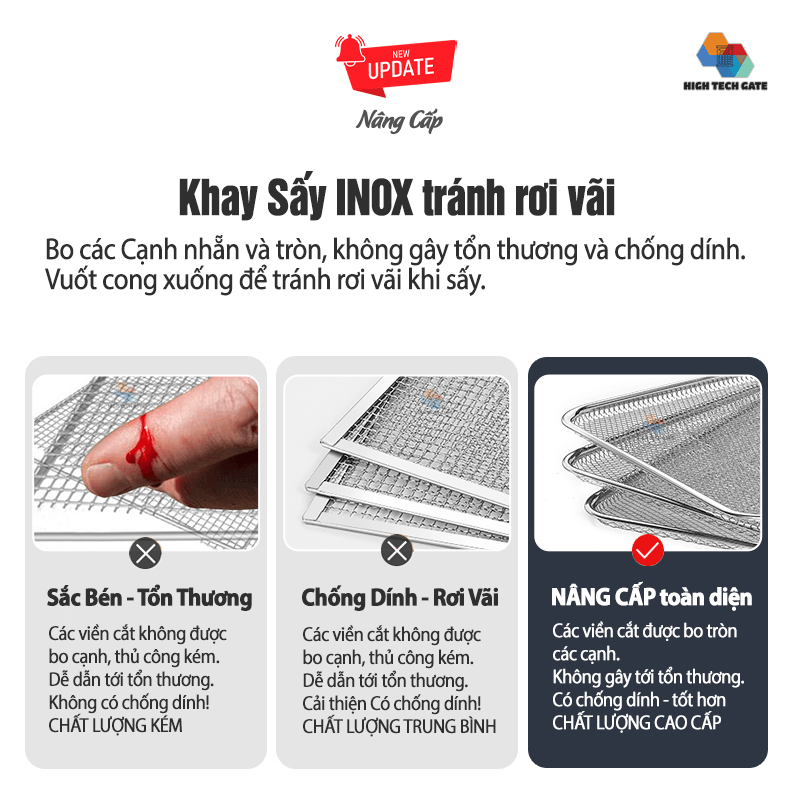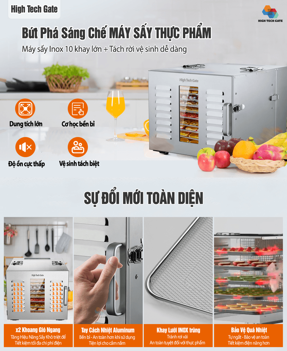 - Với thiết kế cực kì đặc biệt, giúp người dùng có thể sở hữu 1 chiếc máy sấy thực phẩm vừa bền bỉ, vừa hiệu quả mà lại dễ dàng sử dụng. Máy sấy thực phẩm inox HTG-ST01 được tách biệt 2 phần riêng biệt phần điện và phần khoang sấy, giúp việc vệ sinh cực kì dễ dàng. Trang bị dung tích lớn hơn so với các máy cùng phân loại, khay sấy inox kích thước lớn lên đến 40x40cm, có 10 khay hoàn chỉnh. Có thể sấy khô được nhiều thực phẩm và dược liệu hơn so với các máy trên thị trường cùng với số khay.