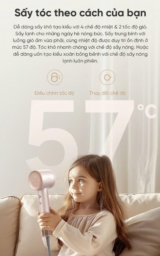 - Dễ dàng sấy khô tạo kiểu với 4 chế độ nhiệt & 2 tốc độ gió. Sấy lạnh cho những ngày hè nóng bức. Sấy trung bình với luồng gió ấm vừa phải, cùng nhiệt độ được duy trì ổn định ở mức 57 độ. Tóc khô nhanh chóng với chế độ sấy nóng. Hoặc dễ dàng uốn tạo kiểu xoăn bồng bềnh với chế độ sấy nóng lạnh luân phiên.