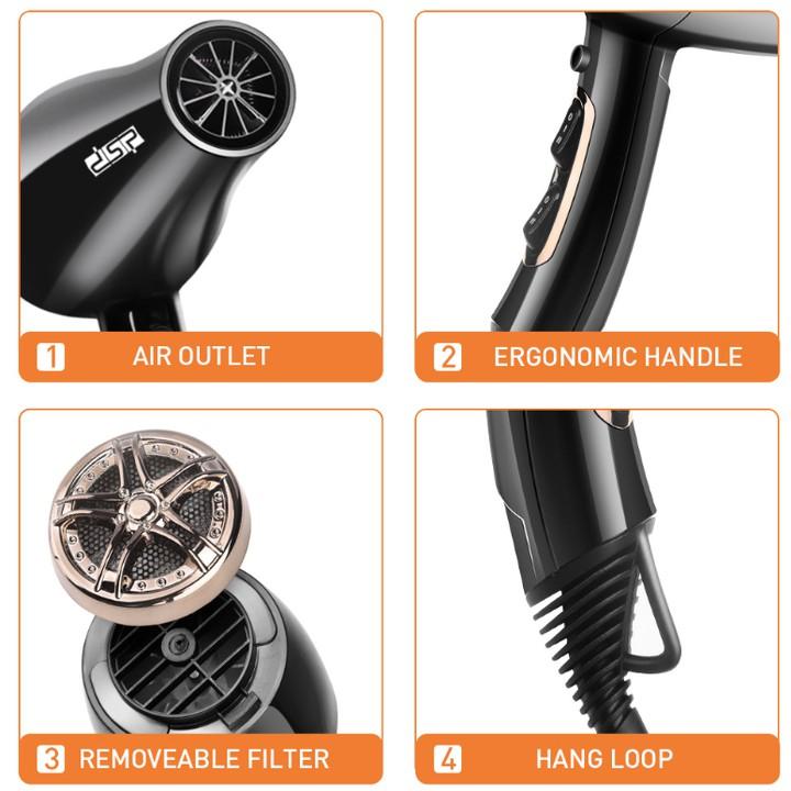 - Chỉ cần sở hữu máy sấy tóc cao cấp DSP 30088, bạn sẽ chẳng phải lo tóc bị sơ yếu, cháy hoặc gãy rụng - đây là nỗi lo chung mà các cô nàng sử dụng máy thông thường quan tâm. Tạo luồng khí mát lạnh, không làm tóc bị khô, cháy, cho bạn yên tâm sử dụng