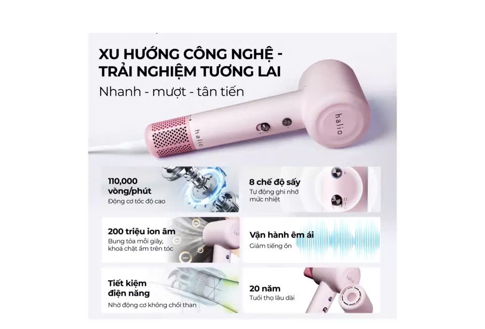 Cùng khám phá máy sấy Halio High Speed Ionic được trang bị động cơ mạnh mẽ với tốc độ lên đến 110,000 vòng/phút giúp tóc khô nhanh gấp đôi so với các loại máy sấy tóc thông