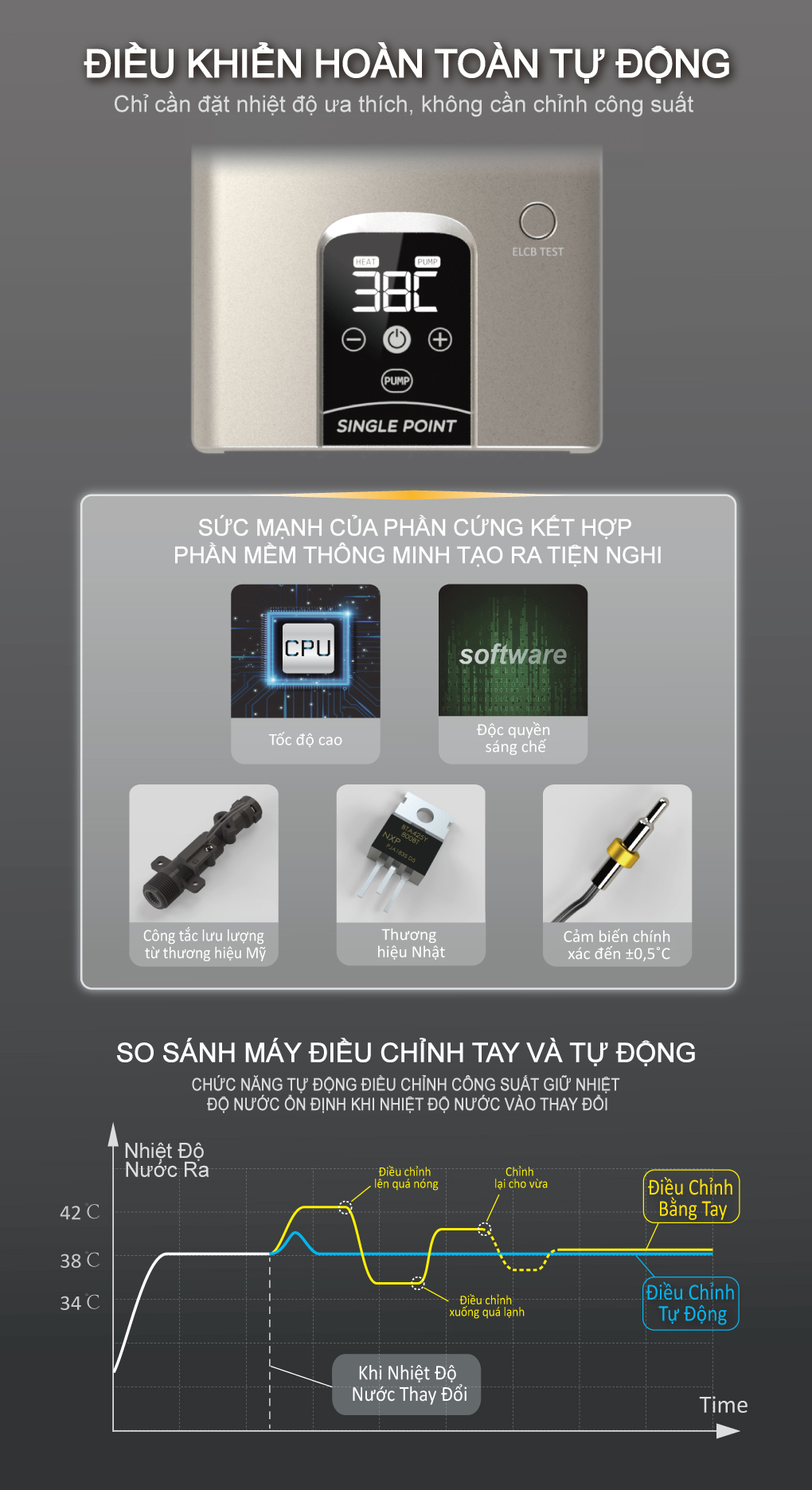 - Sản phẩm duy nhất tại Việt Nam sử dụng công nghệ tự động điều chỉnh công suất, ổn định nhiệt độ mà KHÔNG dùng cảm biến lưu lượng.
