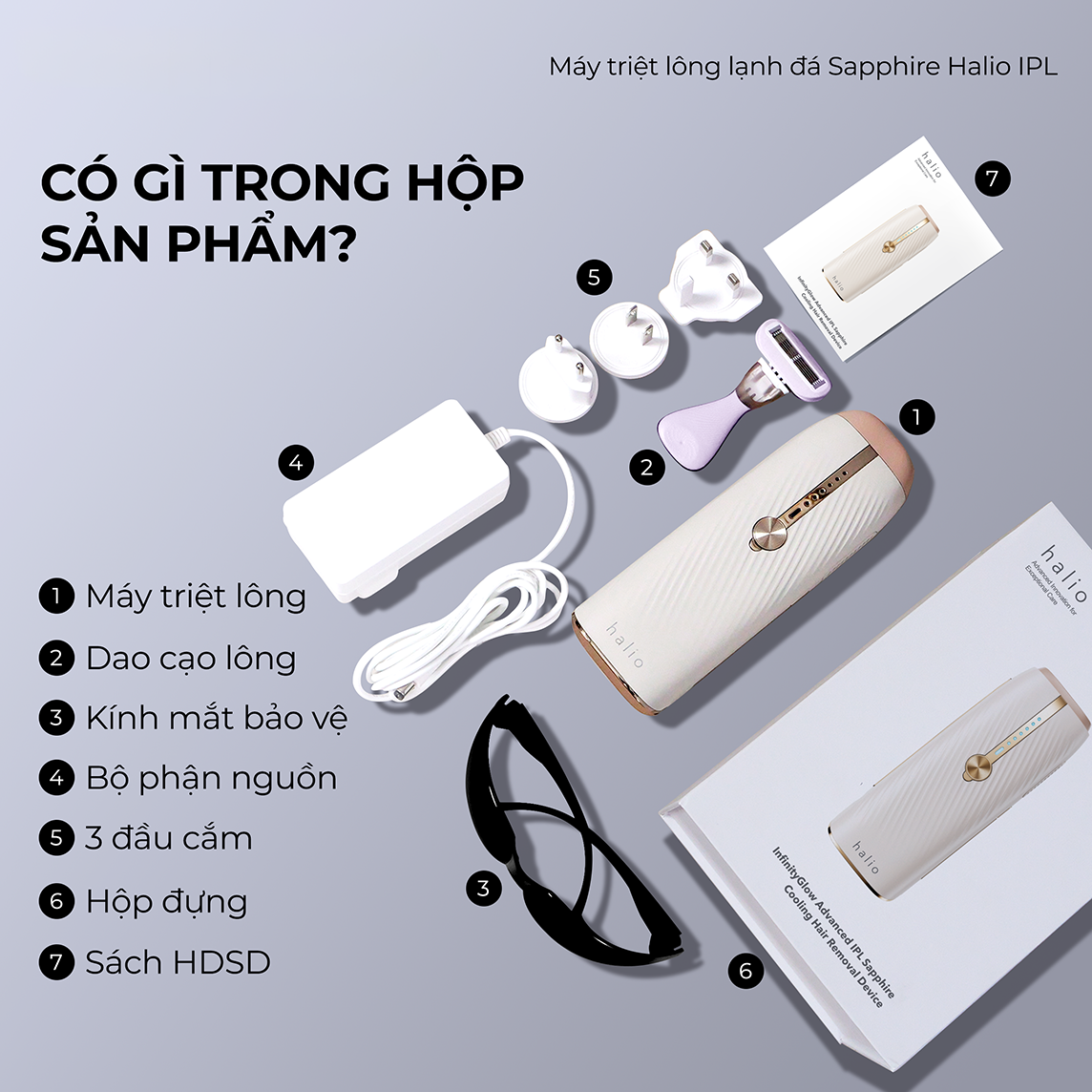 Giới thiệu Máy Triệt Lông Halio InfinityGlow Advanced IPL Sapphire Cooling là người bạn đồng hành lý tưởng, mang đến cho bạn làn da mịn màng và rạng rỡ. Được thiết kế với ba chế độ khác nhau: Chế độ Triệt Trượt cho các vùng da lớn, Chế độ Triệt Điểm cho các vùng da nhỏ, Chế độ Xung kép giúp tăng hiệu quả triệt lông gấp đôi và Chế độ Xung đơn. Công nghệ làm mát Sapphire giữ nhiệt độ thiết bị ở mức 10°C để ngăn ngừa bỏng rát, trong khi tốc độ phát xung siêu nhanh chỉ 0,25 giây giúp rút ngắn thời gian triệt toàn thân chỉ trong 10 phút. Máy Triệt Lông Halio InfinityGlow Advanced IPL Sapphire Cooling cũng được trang bị số lần phát xung không giới hạn, mua một lần sử dụng trọn đời. Thêm vào đó, với ổ cắm đa điện áp, sản phẩm trở nên tiện lợi khi mang theo du lịch. Tận hưởng trải nghiệm triệt lông thoải mái và làn da mịn màng cùng với Máy Triệt Lông Halio InfinityGlow Advanced IPL Sapphire Cooling. Cách sử dụng Bước 1: Kiểm tra màu da và màu lông trước khi triệt lông để đảm bảo bạn phù hợp để sử dụng máy triệt lông lạnh Sapphire của Halio