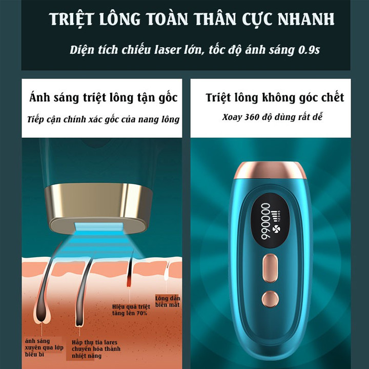 Máy Triệt Lông Vĩnh Viễn - Công Nghệ Tia Lares Hiệu Quả Cực Cao  Công nghệ IPL là gì? Công nghệ IPL viết tắt từ từ tiếng Anh (Intense Pulsed Light) sử dụng nguồn ánh sáng cường độ cao từ bóng đèn Flashlamp xuyên qua các kính lọc ở các mức khác nhau trong thời gian cực ngắn (khoảng 1 – 20 mili giây) và có thể chia thành nhiều xung khác nhau. IPL khác với laser, laser là ánh sáng cưỡng bức một bước sóng, còn IPL là một chùm sóng với quang phổ rộng từ 420nm – 1200nm. Ứng dụng triệt lông tận gốc bằng công nghệ IPL ( hoặc là công nghệ triệt lông nhanh IPL SHR) được sử dụng rất phổ biến và cho kết quả rất tốt, theo cơ chế các tế bào sắc tố đen trong nang lông cũng hấp thu ánh sáng và nóng lên, nang lông bị phá hủy, làm sợi lông bị chết đi, và không cho nang lông phát triển, từ đó đạt hiệu quả triệt lông hoàn hảo. Đặc điểm: ️ Điện áp 100 ~ 240V, màn hình tinh thể LCD phù hợp với tất cả các quốc gia trên thế giới. ️ Công suất 36W, dòng điện 3A, tần số phát quang 990000 xung ️ Không gây đau: 5 mức năng lượng tối ưu có thể điều chỉnh theo khả năng chịu đựng của da. Sử dụng dễ dàng, không gây đau đớn, không làm tổn thương da. Đèn LED cho thấy mức năng lượng rõ ràng. ️ Vùng áp dụng nhanh và lớn: Bước sóng 570-1100NM, kích thước không quá lớn hoặc không quá nhỏ, phù hợp cho nhiều đường cong cơ thể, hiệu quả cao và tốc độ nhanh, chỉ mất vài phút để loại bỏ lông cơ thể chồng chéo, dùng cho các vùng da khó tiếp cận bằng phương pháp tẩy lông truyền thống ️ An toàn: Không ảnh hưởng đến sự tiết mồ hôi và bã nhờn thông thường ️ Thuận tiện: Thiết kế tiện dụng và dễ dàng cầm nắm ️ Máy triệt lông triệt theo chu kì lông 1-2 tuần 1 lần trong 2 tháng đầu. 1-2 tháng 1 lần trong những lần triệt tiếp theo ️ Hướng dẫn sử dụng: Trước khi triệt mình cạo lông vùng cần triệt với gel hay dưỡng ẩm. tuyệt đối không nhổ và dùng lăn khử mùi trước đó 24 tiếng.Trước khi dùng cạo sạch lông-bôi gel hoặc dưỡng ẩm trước khi dùng.Bôi lớp mỏng thôi. Tiếp theo cắm điện, chọn mức nhiệt phù hợp, lần đầu triệt mình khuyên các bạn nên chọn mức nhẹ nhất (mức 1) để xem phản ứng của da có người chịu được mức cao 2-3 ngay từ lần đầu tiên nhưng mình chỉ chọn triệt ở mức thấp nhất nên bắt đầu từ mức 1 và tăng dần mức khi đã quen Lưu ý : ️ Cái nút tròn to chính là nút điều chỉnh xung khi triệt, nếu di máy thì giữ tay liên tục còn nếu triệt điểm thì chỉ cần nhấn , thả là ok. ️ Mỗi lần dùng máy không quá 30phút