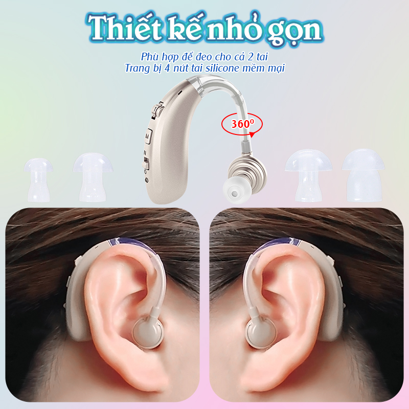 Máy trợ thính pin sạc Axon A-360 có thiết kế nhỏ gọn, phù hợp để đeo cho cả hai tai. Thiết bị còn được trang bị 4 nút tai silicon mềm mại, ôm khít lỗ tai, mang đến cảm giác thoải mái khi sử dụng trong thời gian dài.