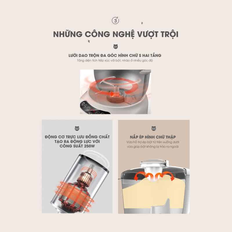 - trang bị 3 đầu trộn bằng thép không gỉ siêu bền, siêu an toàn cho phép người dùng có thể nhào bột làm bánh, đánh kem, đánh trứng, quết giò/chả, một cách mịn, nhuyễn nhất.