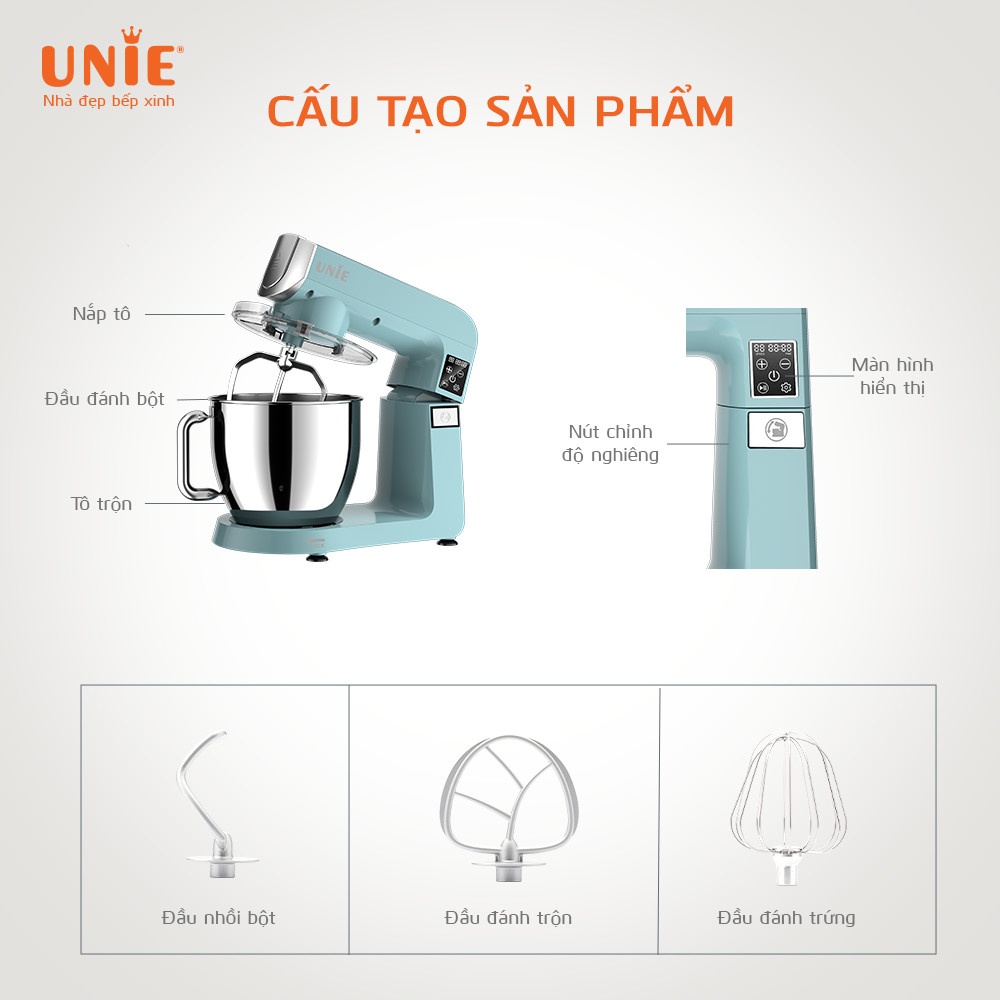 Máy nhồi bột đa năng UNIE UE-990 có các chức năng: nhồi bột, trộn thực phẩm, đánh trứng, đánh kem. UE-990 có 10 nấc tốc độ có thể điều chỉnh tốc độ theo yêu cầu, giúp thực phẩm đạt được chất lượng tốt hơn. Trang bị 3 bộ phụ kiện chính được làm bằng hợp kim kẽm không gỉ: Đầu nhồi bột, đầu đánh trộn và đầu đánh trứng. Ngoài ra, UNIE UE-990 dung tích lớn 6.5L thoải mái trộn lượng bột lớn phù hợp với những chị em đam mê làm bánh. ƯU ĐIỂM NỔI BẬT CỦA MÁY NHỔI BỘT UNIE UE-990 Công suất lớn 1800W cho thành phẩm bột mịn hơn Unie UE-990 sở hữu công suất 1800W giúp máy hoạt động mạnh mẽ, bền bỉ. Trộn được nhiều bột hơn, thành phẩm bột mịn mướt hỗ trợ bạn làm nên những mẻ bánh ngon nhất. Dung tích thố trộn 6.5L kết hợp với nắp chống văng thông minh Với dung tích thố trộn 6.5L bạn có thể đánh được 1000g bột khô thêm 538g nước trong 1 lần đánh. Thố trộn làm bằng chất liệu inox 304 sáng bóng, chống han gỉ rất an toàn. Ngoài ra, máy có thiết kế phần nắp chống văng thông minh nên bạn yên tâm là bột sẽ luôn nằm gọn trong thố không bị bắn ra ngoài trong quá trình đánh trộn. Chất liệu thân kim loại nguyên khối bền bỉ kết hợp lớp vỏ sơn tĩnh điện màu xanh pastel hiện đại, trẻ trung Phần thân máy sử dụng thân kim loại nguyên khối giúp tăng trải nghiệm người dùng. Ngoại hình UE-990 nhìn khỏe khoắn hơn và độ bền cao không lo tình trạng hoen gỉ khi sử dụng máy trong thời gian dài. Lớp vỏ được sơn tĩnh điện màu xanh pastel đậm chất vintage sẽ phù hợp với những bạn thích thiết bị nhà bếp vừa tiện dụng vừa là vật decor cho căn bếp thêm ấm cúng. Phụ kiện đa dạng, gồm 3 đầu đánh sử dụng linh hoạt Máy nhồi bột thế hệ mới Unie UE-990 có 3 đầu trộn linh hoạt dễ dàng tháo lắp và sử dụng gồm: đầu nhồi bột, đầu đánh trộn và đầu đánh trứng. 3 đầu phụ kiện đều được làm chất liệu an toàn, chống han gỉ nên bạn yên tâm sử dụng. Màn hình LED hiển thị rõ ràng, cài đặt điều chỉnh thời gian linh hoạt Ngoài yếu tố ngoại hình băt mắt, Máy nhồi bột Unie UE-990 sở hữu bảng điều khiển cảm ứng hiện đại hiện thị thời gian, tốc độ đánh và tùy chỉnh cài đặt thời gian theo ý giúp hỗ trợ bạn tối đa trong quá trình làm bánh. Màn hình LED hiện thị các thông số thời gian, tốc độc to rõ ràng dễ quan sát. Chân đế cao su chắc chắn Thiết kế phân chân mút cao su giúp khi máy hoạt động ở công suất lớn nhất vẫn có thể bám chắc vào mặt bàn phẳng tăng tuổi thọ cho máy và tính an toàn của sản phẩm Vệ sinh dễ dàng Với vỏ ngoài được phủ sơn tĩnh điện và toàn bộ phụ kiện được làm bằng inox 304 sáng bóng, phụ kiện tháo dời linh hoạt nên việc vệ sinh máy rất dễ dàng. Với phụ kiện bạn làm sạch bằng dung dịch tẩy rửa thông thường. Với thân máy dùng khăn mềm lau sạch là được. Lưu ý không nhúng phần thân máy vào nước sẽ ảnh hưởng tới phần động cơ bên trong. THÔNG SỐ KỸ THUẬT TỔNG QUAN VỀ MÁY NHỒI BỘT UNIE UE-990 Máy nhồi bột đa năng là gì? Máy nhồi bột hay còn được gọi là máy đánh bột, máy trộn bột. Trước kia nếu muốn làm bánh, bạn phải tự tay nhào bột còn giờ đây sử dụng máy nhồi bột gia đình hay máy nhồi bột công nghiệp. Tại sao nên mua máy nhồi bột đa năng Với nhiều người thì máy nhồi bột còn khá là mới mẻ nên họ cũng có những băn khoăn không biết loại máy này có tốt không, nhồi bột có đều không? Vậy chúng ta hãy cùng xem những lý do để bạn chọn máy nhồi bột làm bánh nhé: