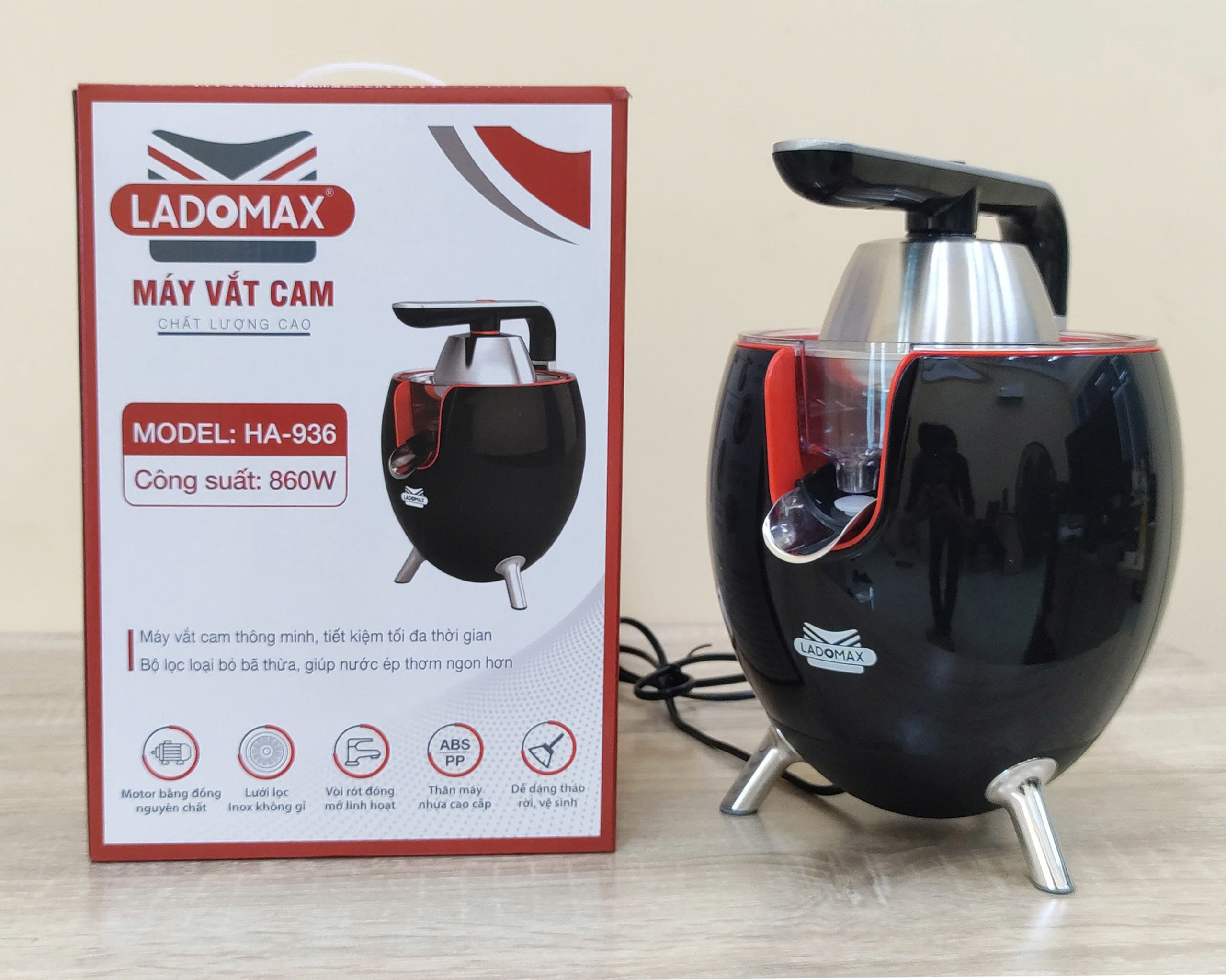 Thông tin sản phẩm Thương hiệu: Ladomax Máy: Máy vắt cam, vắt chanh Công suât: 860W Model :HA936 Núm: 2 đầu nấm lớn nhỏ Khay lọc: Inox Điện áp: 220-240V, 50/60HZ Bảo hành 12 tháng