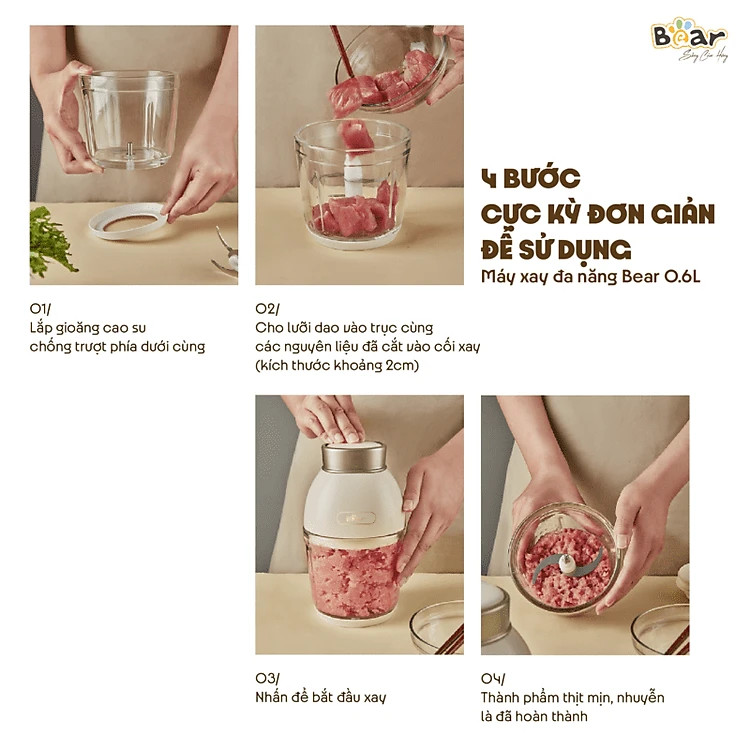 - Hướng dẫn sử dụng máy xay ăn dặm Bear QSJ-D02Q1 0.6L Bước 1: Lắp trục xay, lắp gioăng cao su chống trượt ở dưới đáy. Bước 2: Cho nguyên liệu đã cắt vào phần dung tích cốc (tránh cho nguyên liệu vượt mức vạch cốc). Lắp dao kèm nắp đậy vào phần cốc xay sao cho trùng với đầu trục xay. Sau đó, lắp tiếp phần thân máy lên trên cùng nắp đậy. Bước 3: Cắm dây điện vào nguồn, sau đó nhấn công tắc ở phần đỉnh trên cùng của thân máy để bắt đầu xay. Bước 4: Thành phẩm với thịt nhuyễn và mịn là đã xay xong.