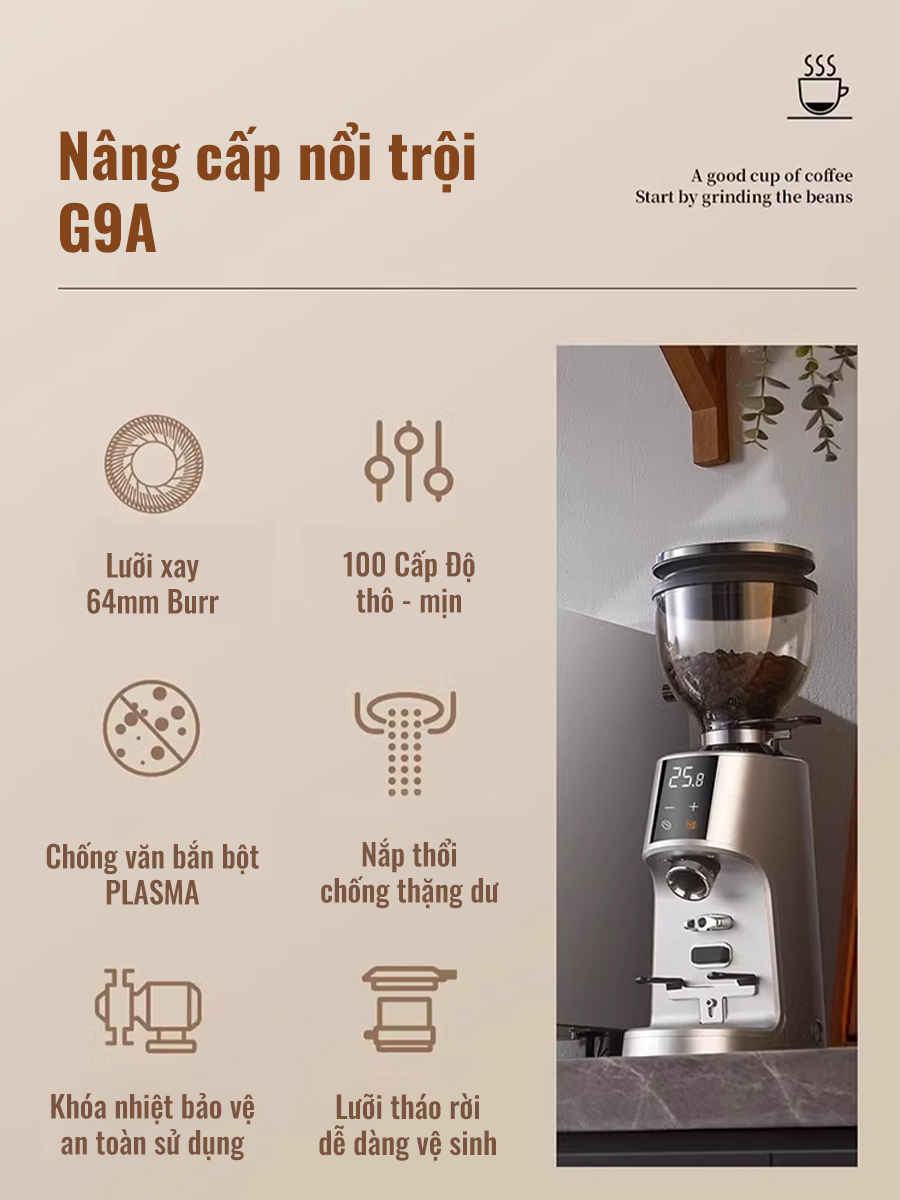 Máy xay cà phê G9A chuyên nghiệp thương mại FLAT BURR 64mm Sở hữu 100 cấp độ xay từ thô đến siêu mịn để pha chế các loại phương thức cafe khác nhau Xay hạt cafe Auto on demand từ hạt mịn cho pha máy chiết xuất crema thơm, sánh, mịn Một chiếc máy để bàn vượt trội trong phân khúc, đánh bại mọi đối thủ với chất lượng xay hạt cà phê. Lưỡi xay 64mm Flat Burr, Lưỡi xay có thể tháo rời - dễ dàng vệ sinh, bảo trì Vòng ren cân Brass bền bỉ, ổn định Như chúng ta đã biết, khi pha cà phê bằng máy, độ mịn của cà phê hạt khi xay ra dạng bột cần phải đủ mịn để có thế chiết xuất ra 1 ly cà phê espresso chuẩn Espresso. Tạo đủ áp suất trong tay cầm, để chiết hết tinh chất crema trong cà phê.