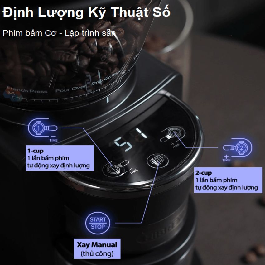 - Với lưỡi dao chất liệu thép không gỉ SS420 bền bỉ bền bỉ sở hữu 31 cấp độ xay, từ dạng thô đến dạng mịn. Chính vì thế nó có thể đáp ứng tối thiểu độ mịn cho 1 ly cà phê espresso chuẩn Ý. Thông số kỹ thuật