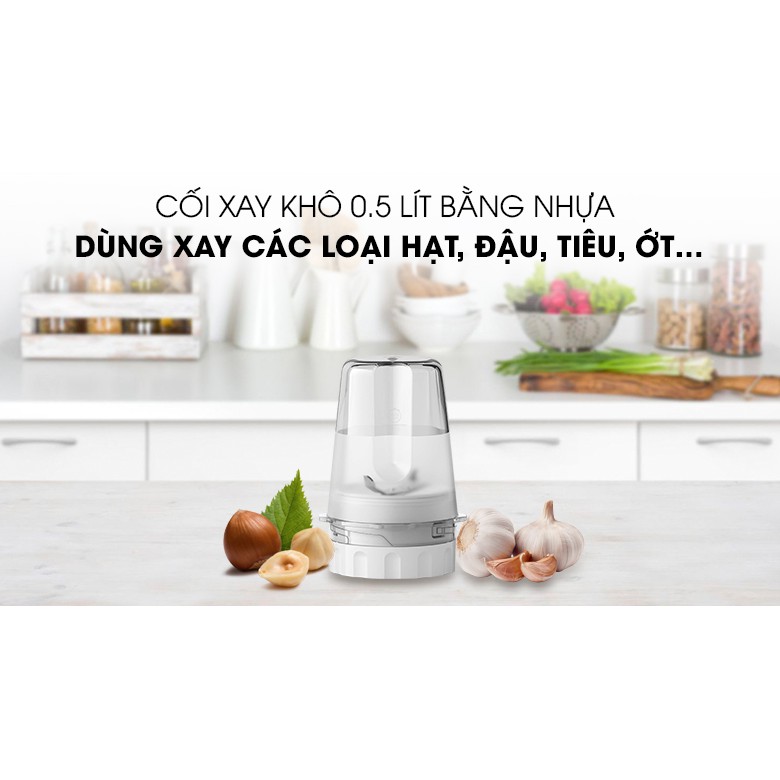 ĐẶC ĐIỂM NỔI BẬT - Máy được trang bị 3 cối xay: Cối sinh tố dung tích 1.5 lít, cối xay thịt dung tích 0.5 lít, cối xay khô dung tích 0.2 lít. - Động