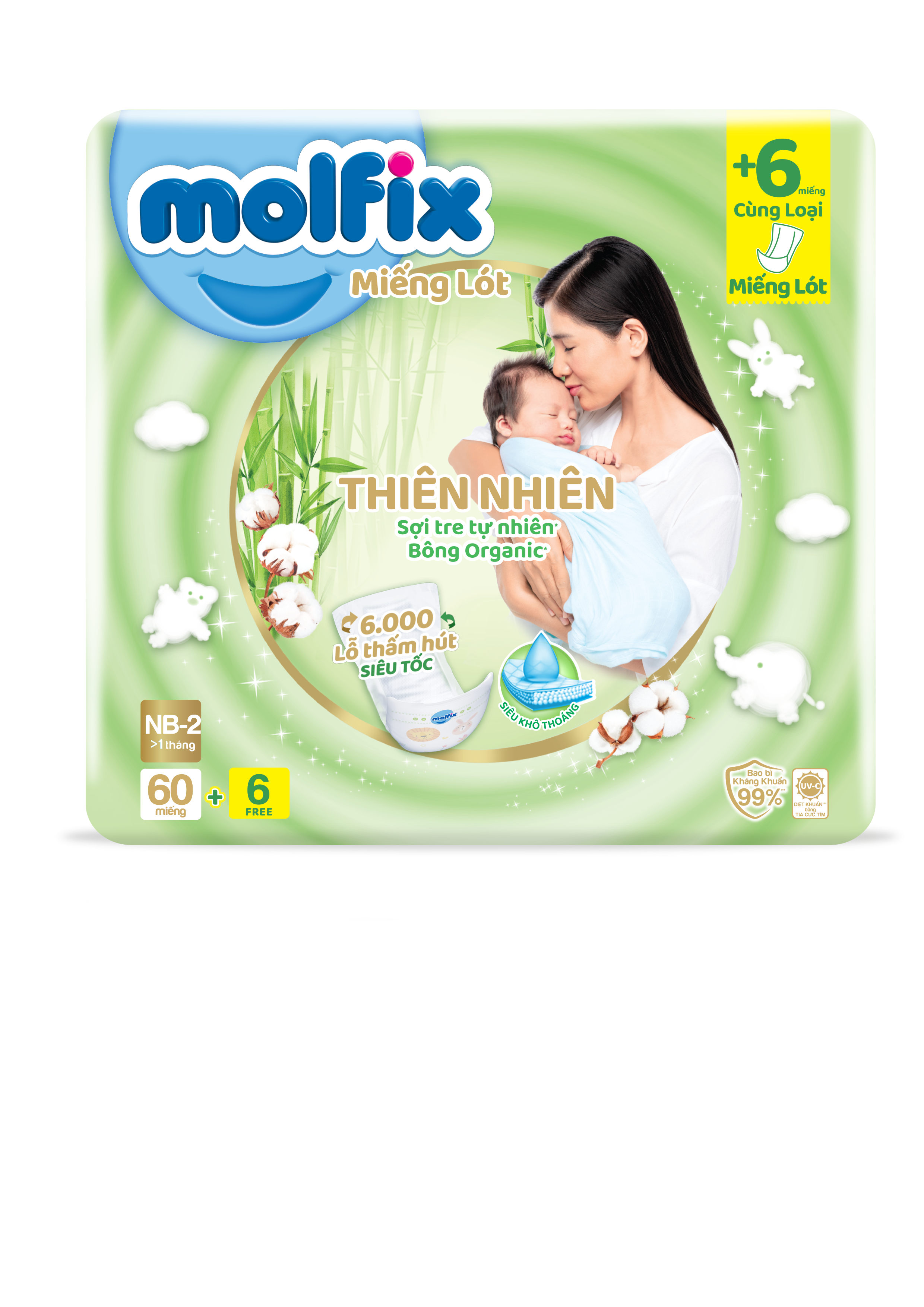 ✨Miếng lót sơ sinh Molfix Thiên nhiên Super Jumbo Newborn 2 (trên 1 tháng tuổi) - Gói 60+6 miếng