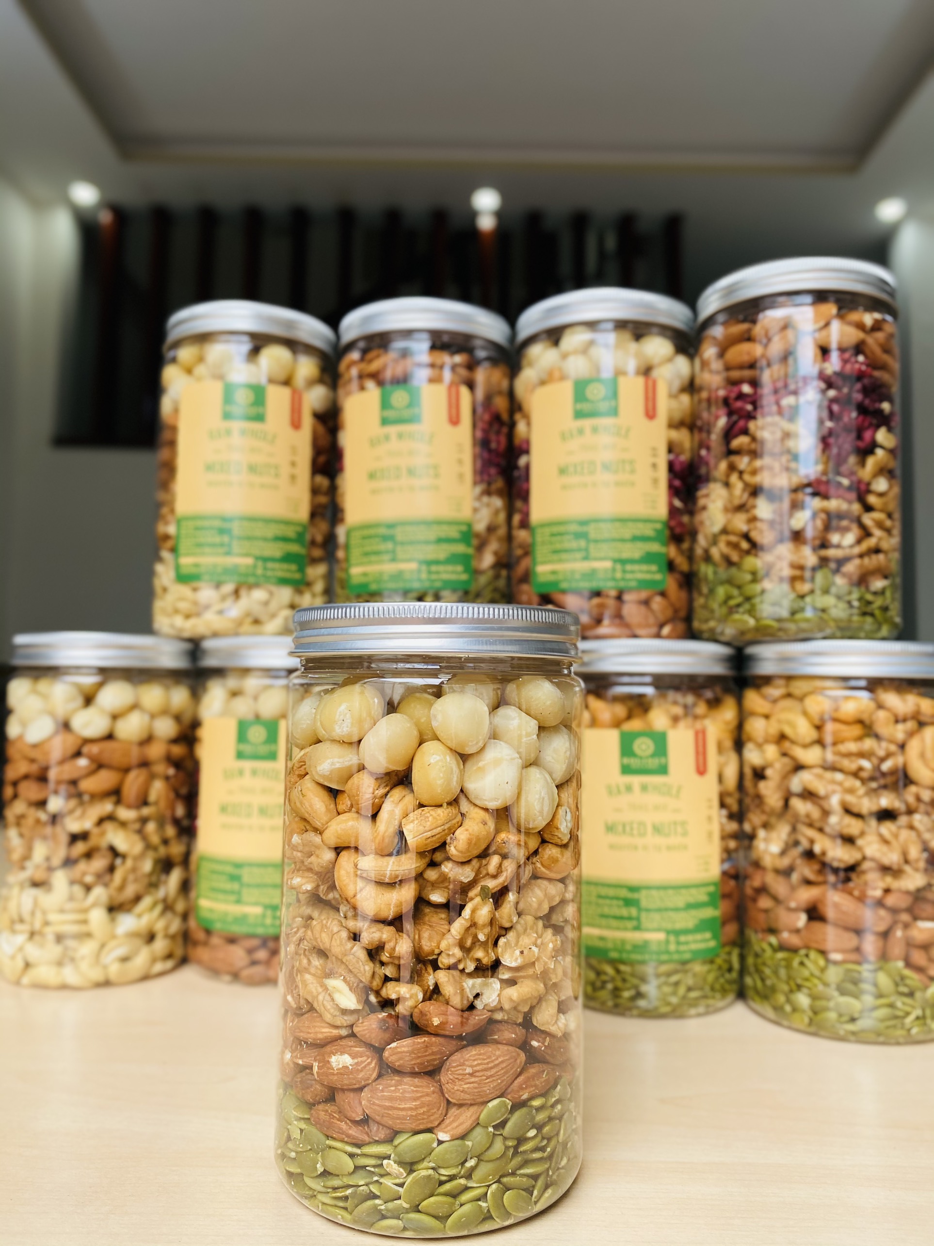 Mix hạt dinh dưỡng ăn liền tại Holinut Thành phần: Hạt bí rang, hạnh nhân rang mộc, nhân óc chó vàng, nhân macca, điều tách lụa. Quy cách: hũ/500gram Công dụng của 5 loại hạt mix