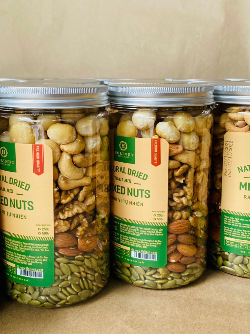 Mix hạt dinh dưỡng ăn liền tại Holinut Thành phần: Hạt bí rang, hạnh nhân rang mộc, nhân óc chó vàng, nhân macca, điều tách lụa. Quy cách: hũ/500gram Công dụng của 5 loại hạt mix điều dinh dưỡng: