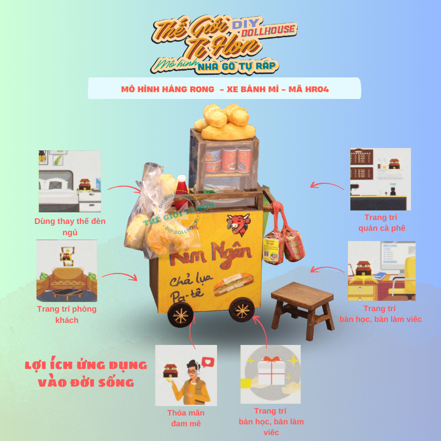 Khách lưu ý:  SẢN PHẨM TỰ SƠN VÀ LẮP RÁP SẢN PHẨM CHƯA BAO GỒM KEO DÁN CHUYÊN DỤNG, PIN VÀ DỤNG CỤ LẮP RÁP (NHÍP, DAO RỌC GIẤY, KÉO,...) SẢN PHẨM KHÔNG ÁP DỤNG ĐỔI TÊN BẢNG HIỆU GIÁ SẢN PHẨM CHƯA BAO GỒM THUẾ VAT, KHÁCH CẦN XUẤT VAT XIN VUI LÒNG LIÊN HỆ THẾ GIỚI TÍ HON QUA CHATBOX Mô Hình Xe Hàng Rong Sài Gòn Xưa Và Nay - Xe Bánh Mì - HR04 ** ĐƠN HÀNG XE HÀNG RONG KHÔNG ÁP DỤNG FREESHIP Bánh mì hầu như không còn xa lạ với mọi người, nhất là người Sài Gòn. Có lẽ vì nó là món có thể ăn bất kỳ lúc nào trong ngày, từ món điểm tâm sáng, bữa trưa, cho đến lót dạ lúc đêm khuya, nên khắp các con đường ngõ hẻm hầu như bạn đều thấy những xe bánh mì quen thuộc. Bánh mì cũng là một món ăn đơn giản và tiện lợi, chỉ mất dăm ba phút là đủ no bụng để người Sài Gòn tiếp tục hòa nhịp vào vòng xoáy của công việc... Mô hình Xe Bánh Mì Sài Gòn Thu Nhỏ - HR04 Tìm Hiểu Mô Hình Tí Hon Thông số mô hình Đánh giá độ khó Kích thước sản phẩm  7.0 x 3.5 x 9.0 CM (Dài x Rộng x Cao) Xuất xứ VIỆT NAM Cân nặng  0.2 Kg Nguyên vật liệu Gỗ, hoa cỏ khô, vải, giấy, kim loại, đèn Led, gốm sứ,nhựa,... Sản phẩm bao gồm Hộp Pin có công tắt, nguyên vật liệu lắp ráp, sách hướng dẫn.  Phụ kiện làm mô hình (Mua riêng): Keo chuyên dụng + Mica Che Bụi + Bộ dụng cụ Kit...()  Shop hỗ trợ lắp ráp luôn nếu bạn có nhu cầu (có phụ phí)